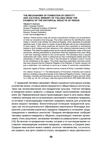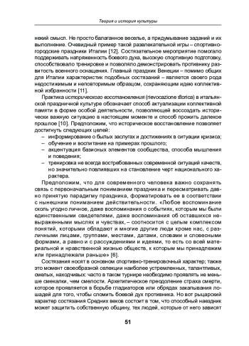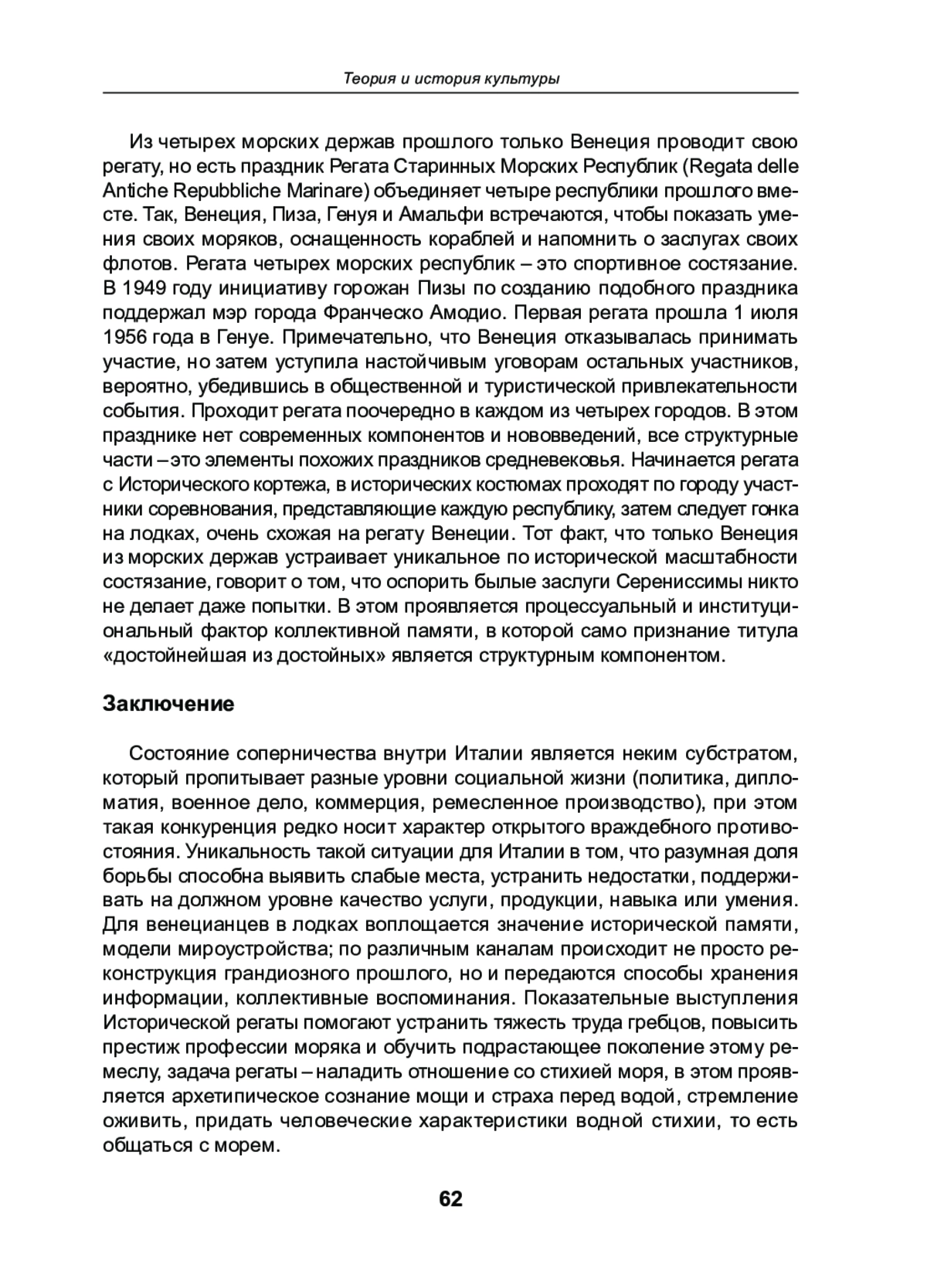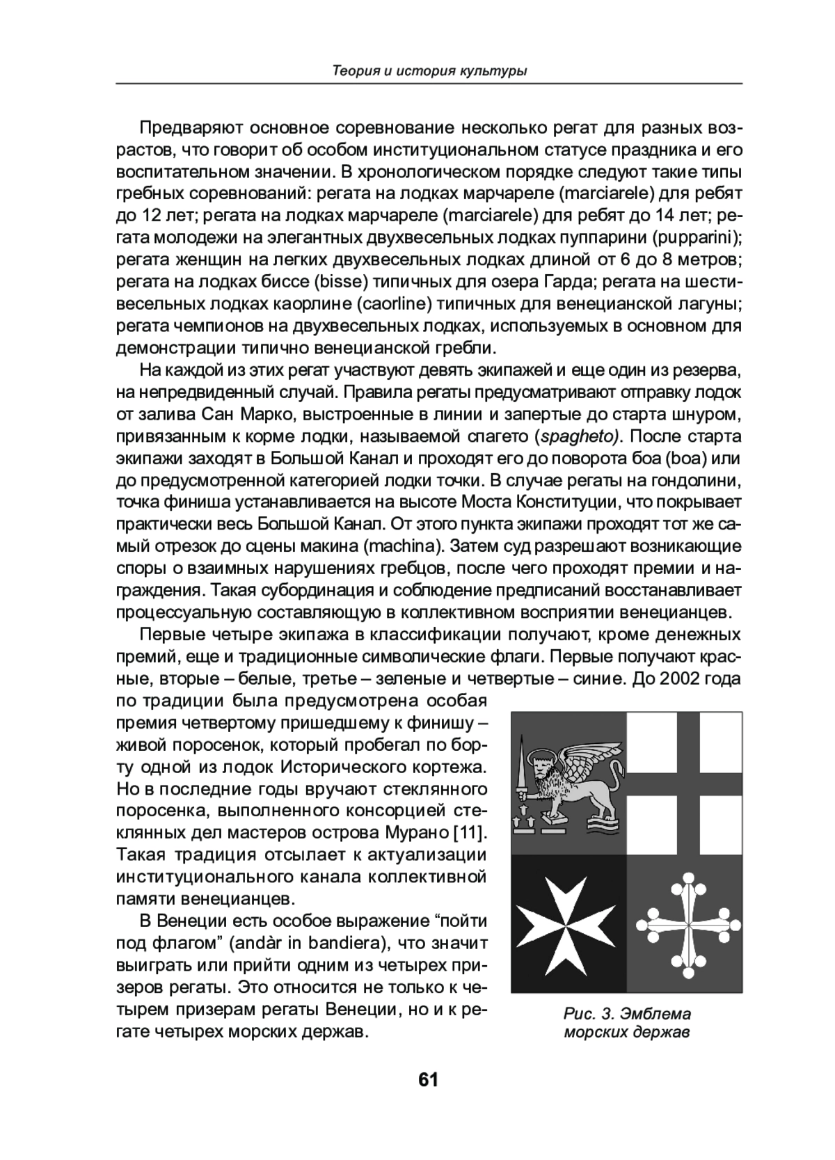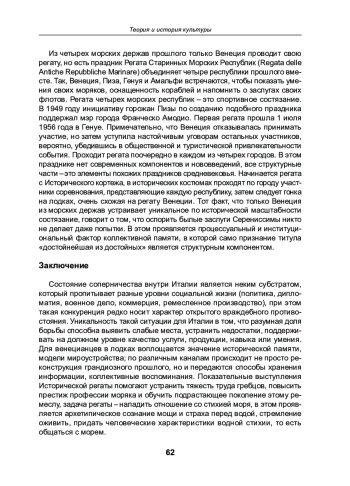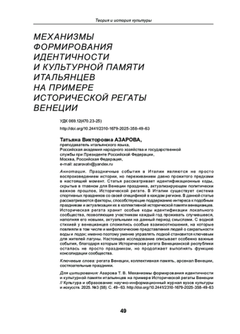 Праздничные события в Италии являются не просто воспроизведением истории, но переживанием давно прожитого предками в настоящий момент. Статья рассматривает идентификационные коды, скрытые в главном для Венеции празднике, актуализирующем политически важное прошлое, Исторической регате. В Италии существует система спортивных праздников со своей спецификой в каждом регионе. В данной статье рассматриваются факторы, способствующие поддержанию интереса к подобным праздникам и актуализации их в коллективной исторической памяти венецианцев. Историческая регата хранит особые коды идентификации локального сообщества, позволяющие участникам каждый год проживать случившееся, наполняя его новыми, актуальными на данный период смыслами. С водной стихией у венецианцев сложились особые взаимоотношения, на которые повлияли в том числе и мифологические представления людей о сакральности воды и лодок; именно поэтому умение управлять лодкой становится ключевым для жителей лагуны. Настоящее исследование описывает особенно важные события, благодаря которым Историческая регата Венецианской республики осталась не просто праздником, но продолжает выполнять функцию консолидации сообщества.