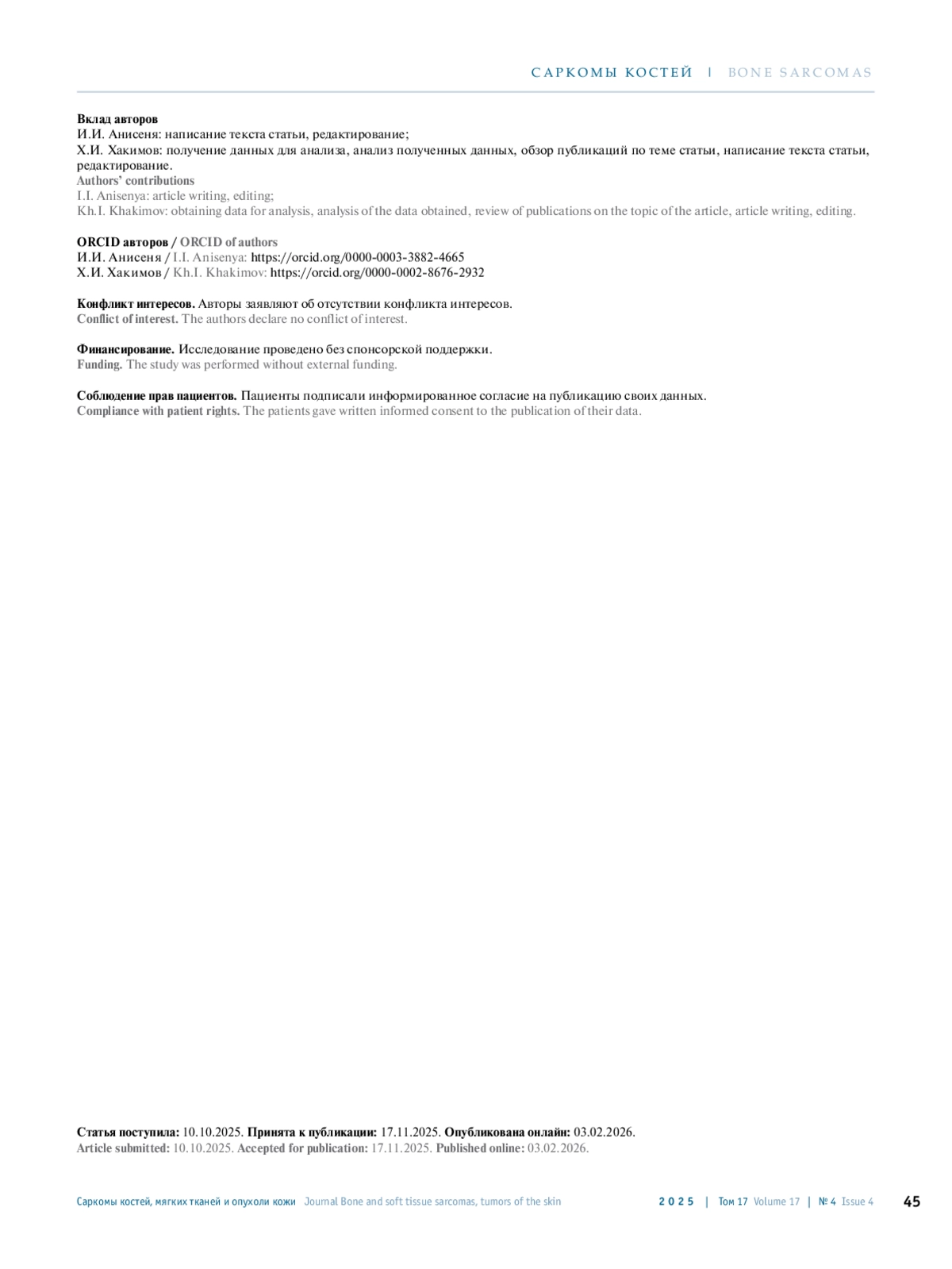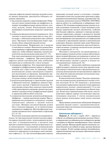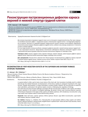 8. Хакимов Х. И., Анисеня И.И., Топольницкий Е.Б. Пластика обширного дефекта грудной стенки с восстановлением реберной дуги сверхэластичными каркасными 3D-модулями после мультивисцеральной резекции при рецидивной саркоме. Онкология. Журнал им. П.А. Герцена 2023;12(5):58-64. DOI: 10.17116/onkolog20231205158.