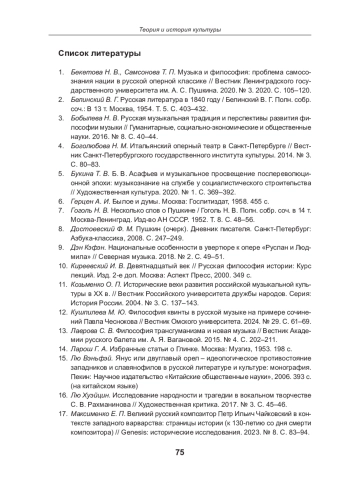1. Бекетова Н. В., Самсонова Т. П. Музыка и философия: проблема самосознания нации в русской оперной классике // Вестник Ленинградского государственного университета им. А. С. Пушкина. 2020. № 3. 2020. С. 105-120. EDN: IBHVCU