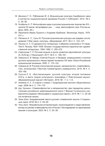 21. Петелин А. С., Сунь Ю. Русская музыкальная культура как предмет исследования // Мир науки, культуры, образования. 2017. № 2. С. 124-127. EDN: YLIDZN