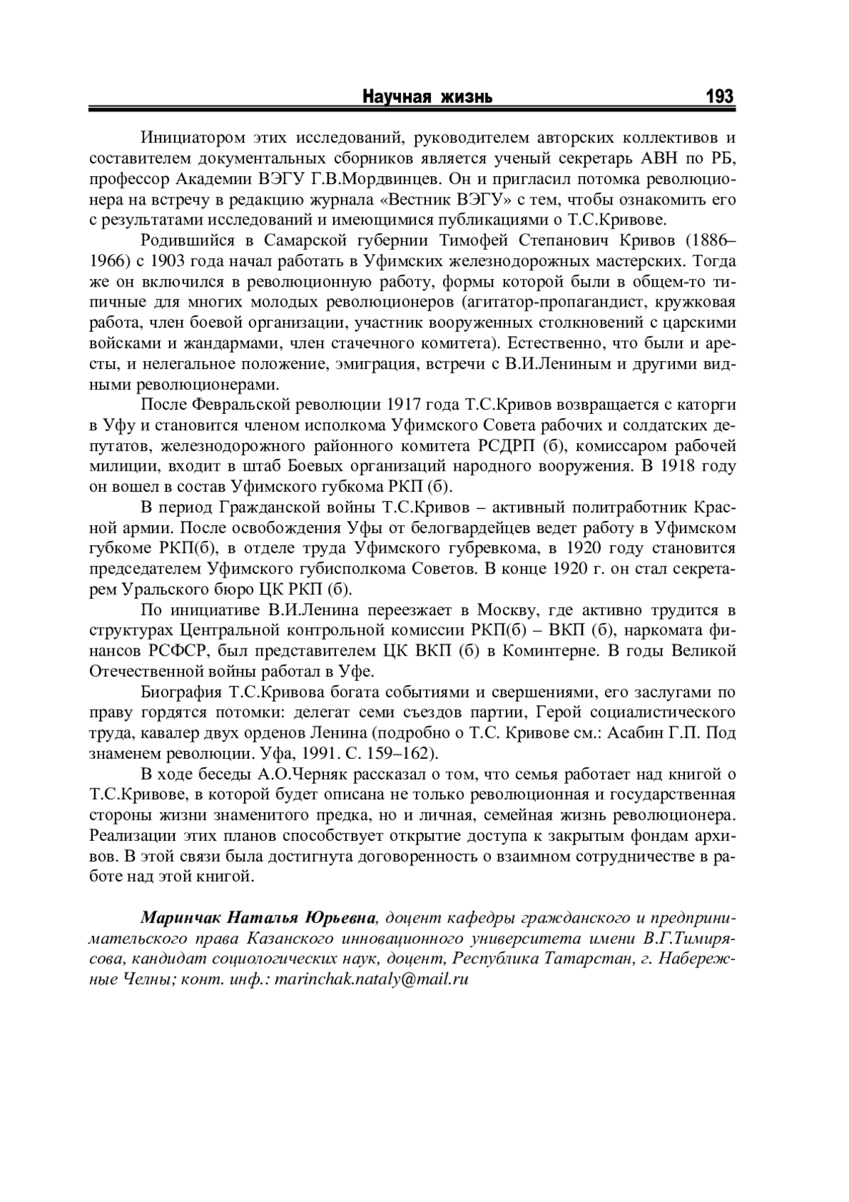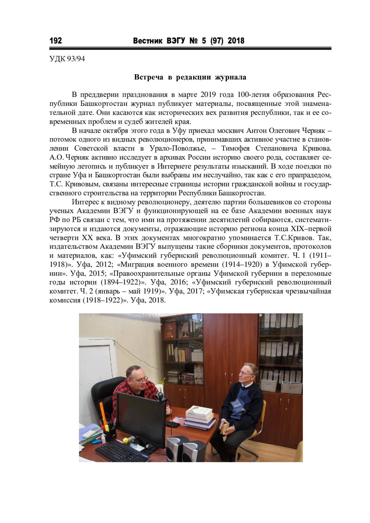 В преддверии празднования в марте 2019 года 100-летия образования Республики Башкортостан журнал публикует материалы, посвященные этой знаменательной дате. Они касаются как исторических вех развития республики, так и ее современных проблем и судеб жителей края. В начале октября этого года в Уфу приехал москвич Антон Олегович Черняк – потомок одного из видных революционеров, принимавших активное участие в становлении Советской власти в Урало-Поволжье, – Тимофея Степановича Кривова. А. О. Черняк активно исследует в архивах России историю своего рода, составляет семейную летопись и публикует в Интернете результаты изысканий. В ходе поездки по стране Уфа и Башкортостан были выбраны им неслучайно, так как с его прапрадедом, Т. С. Кривовым, связаны интересные страницы истории гражданской войны и государственного строительства на территории Республики Башкортостан