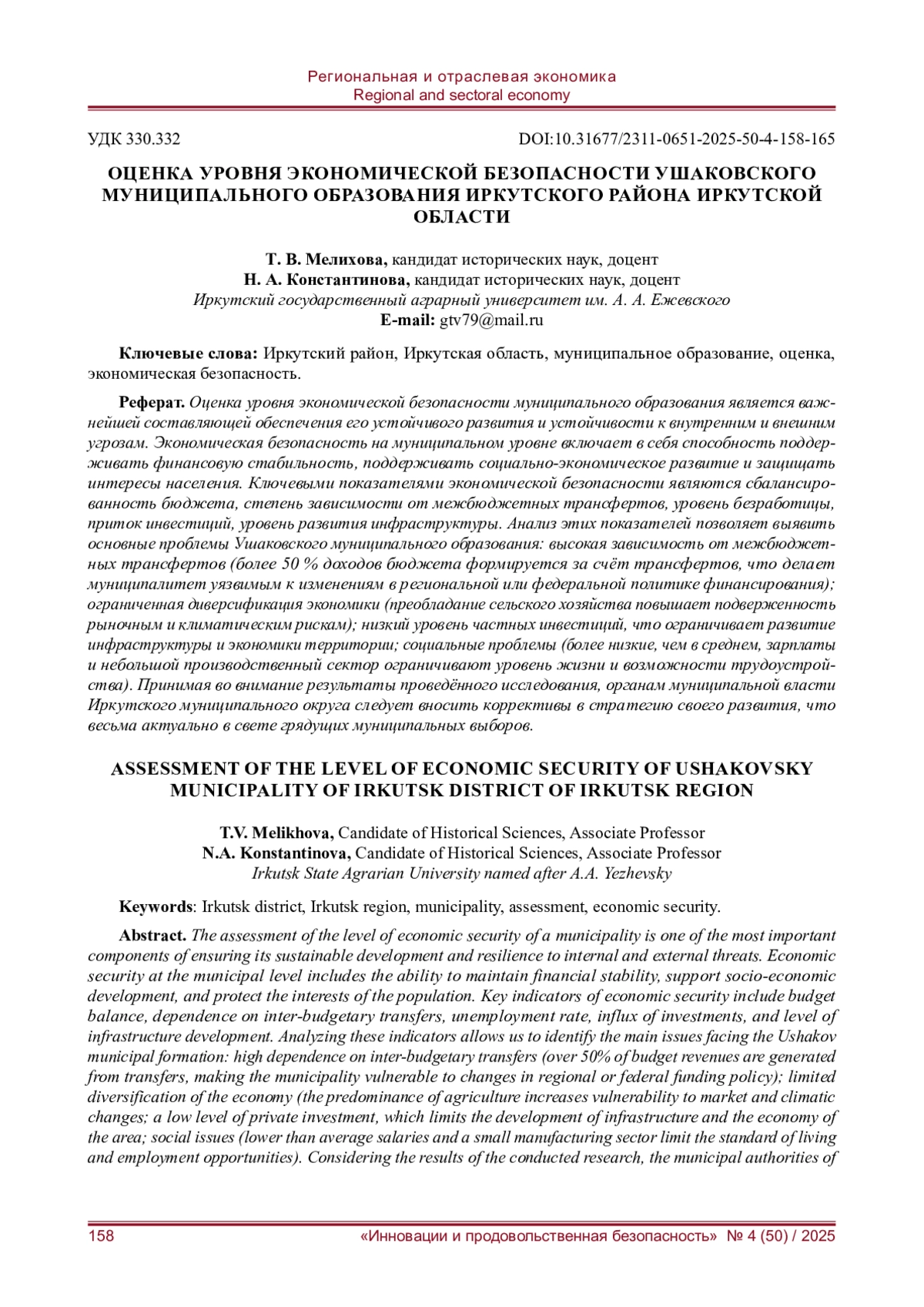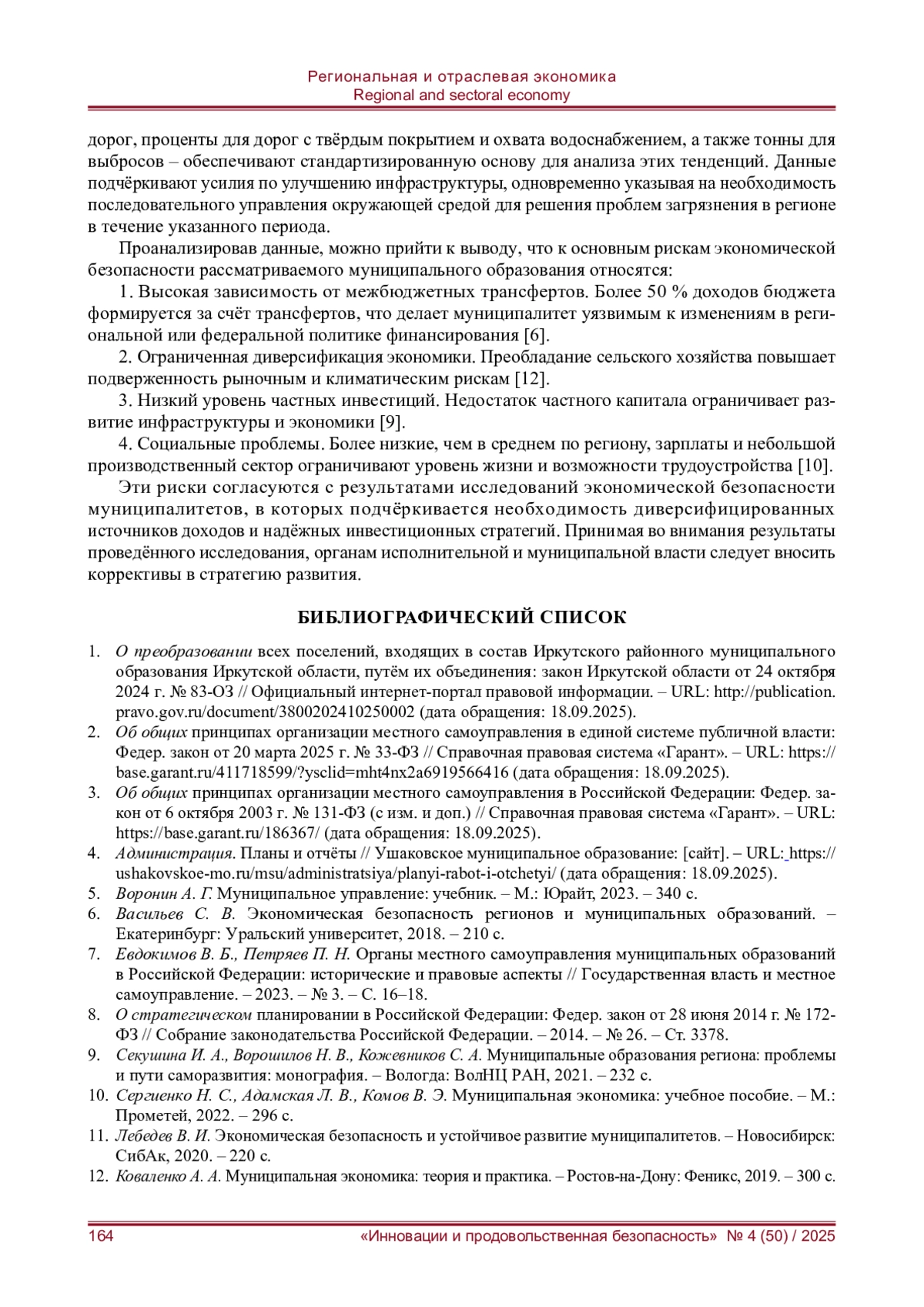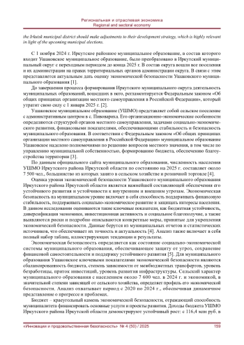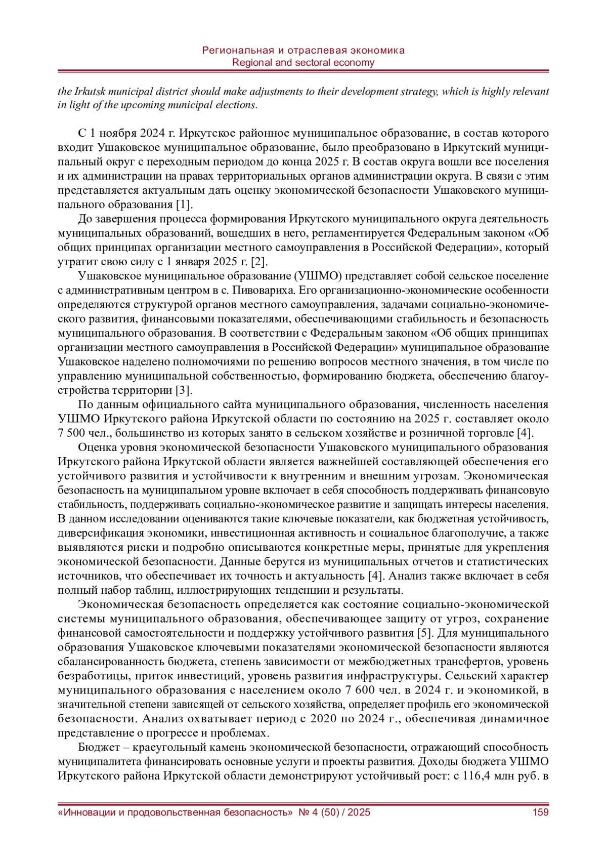 Оценка уровня экономической безопасности муниципального образования является важнейшей составляющей обеспечения его устойчивого развития и устойчивости к внутренним и внешним угрозам. Экономическая безопасность на муниципальном уровне включает в себя способность поддерживать финансовую стабильность, поддерживать социально-экономическому развитию и защищать интересы населения. Ключевыми показателями экономической безопасности являются сбалансированность бюджета, степень зависимости от межбюджетных трансфертов, уровень безработицы, приток инвестиций, уровень развития инфраструктуры. Анализ этих показателей позволяет выявить основные проблемы Ушаковского муниципального образования: высокая зависимость от межбюджетных трансфертов (более 50 % доходов бюджета формируется за счёт трансфертов, что делает муниципалитет уязвимым к изменениям в региональной или федеральной политике финансирования); ограниченная диверсификация экономики (преобладание сельского хозяйства повышает подверженность рыночным и климатическим рискам); низкий уровень частных инвестиций, что ограничивает развитие инфраструктуры и экономики территории; социальные проблемы (более низкие, чем в среднем, зарплаты и небольшой производственный сектор ограничивают уровень жизни и возможности трудоустройства). Принимая во внимание результаты проведённого исследования, органам муниципальной власти Иркутского муниципального округа следует вносить коррективы в стратегию своего развития, что весьма актуально в свете грядущих муниципальных выборов.