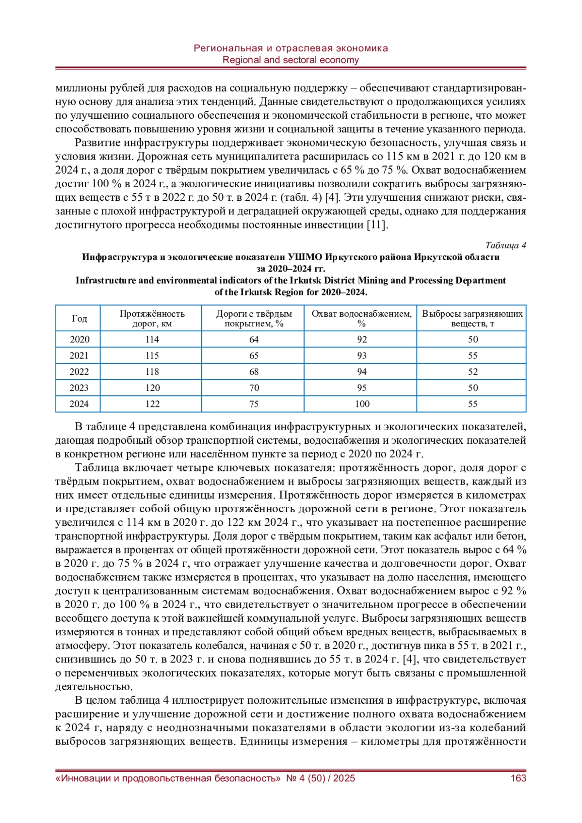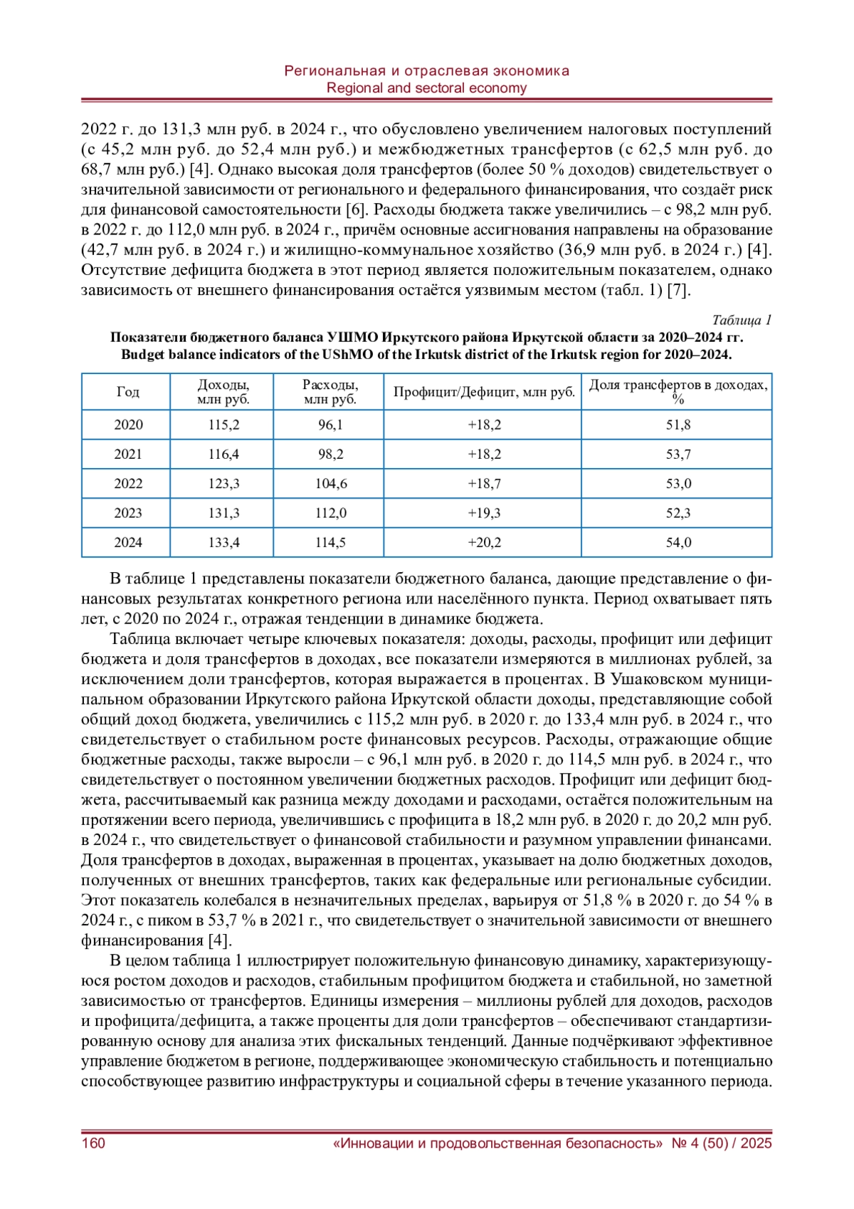 По данным официального сайта муниципального образования, численность населения УШМО Иркутского района Иркутской области по состоянию на 2025 г. составляет около 7 500 чел., большинство из которых занято в сельском хозяйстве и розничной торговле [4]. Оценка уровня экономической безопасности Ушаковского муниципального образования Иркутского района Иркутской области является важнейшей составляющей обеспечения его устойчивого развития и устойчивости к внутренним и внешним угрозам. Экономическая безопасность на муниципальном уровне включает в себя способность поддерживать финансовую стабильность, поддерживать социально‑экономическое развитие и защищать интересы населения. В данном исследовании оцениваются такие ключевые показатели, как бюджетная устойчивость, диверсификация экономики, инвестиционная активность и социальное благополучие, а также выявляются риски и подробно описываются конкретные меры, принятые для укрепления экономической безопасности. Данные берутся из муниципальных отчетов и статистических источников, что обеспечивает их точность и актуальность [4]. Анализ также включает в себя полный набор таблиц, иллюстрирующих тенденции и результаты.