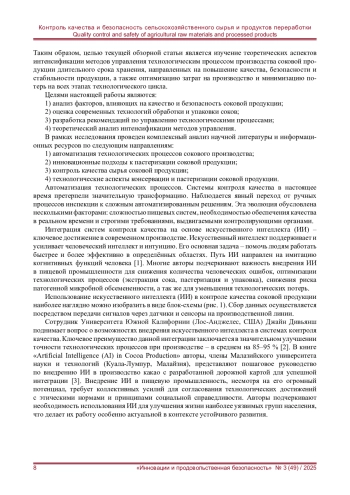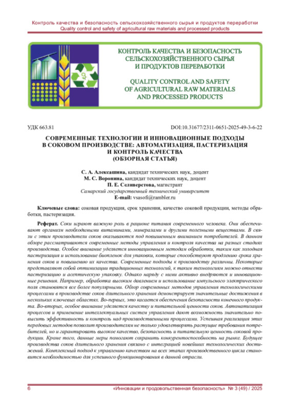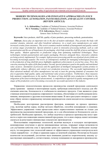 Соки играют важную роль в рационе питания современного человека. Они обеспечивают организм необходимыми витаминами, минералами и другими полезными веществами. В связи с этим производители соков оказываются под повышенным вниманием потребителей. В данном обзоре рассматриваются современные методы управления и контроля качества на разных стадиях производства. Особое внимание уделяется инновационным методам обработки, таким как холодная пастеризация и использование биопленок для упаковки, которые способствуют продлению срока хранения соков и повышению их качества. Современные подходы к производству различны. Некоторые представляют собой оптимизации традиционных технологий, к таким технологиям можно отнести пастеризацию и асептическую упаковку. Однако наряду с ними активно внедряются и инновационные решения. Например, обработка высоким давлением и использование импульсного электрического поля становятся все более популярными. Обзор современных методов управления технологическими процессами в производстве соков длительного хранения демонстрирует значительные достижения в нескольких ключевых областях. Во-первых, это касается обеспечения безопасности конечного продукта. Во-вторых, особое внимание уделяется качеству и питательной ценности соков. Автоматизация процессов и применение интеллектуальных систем управления дают возможность значительно повысить эффективность и контроль над производственными процессами. Успешная реализация этих передовых методов позволит производителям не только удовлетворять растущие требования потребителей, но и гарантировать высокое качество, безопасность и питательную ценность соковой продукции. Кроме того, данные меры помогают сохранить конкурентоспособность на рынке. Будущее производства соков длительного хранения связано с интеграцией новейших технологических достижений. Комплексный подход к управлению качеством на всех этапах производственного цикла становится необходимостью для успешного функционирования в данной отрасли.