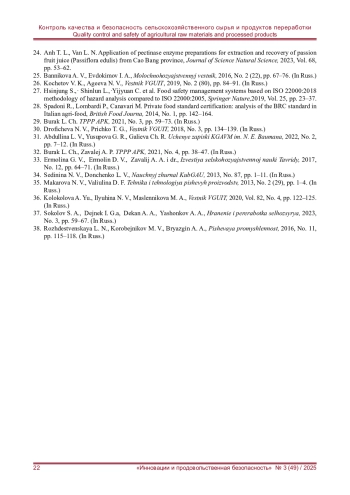 27. Food safety management systems based on ISO 22000:2018 methodology of hazard analysis compared to ISO 22000:2005 / С. Hsinjung,·L. Shinlun,·C. Yijyuan [et al.] // Springer Nature. - 2019. - Vol. 25. - P. 23-37.