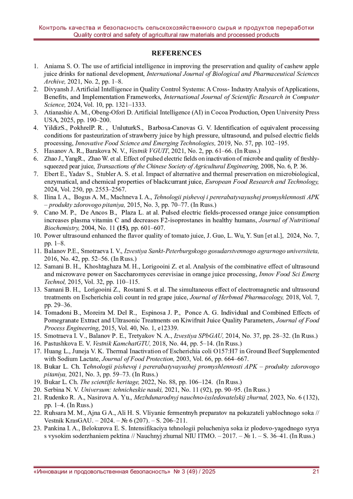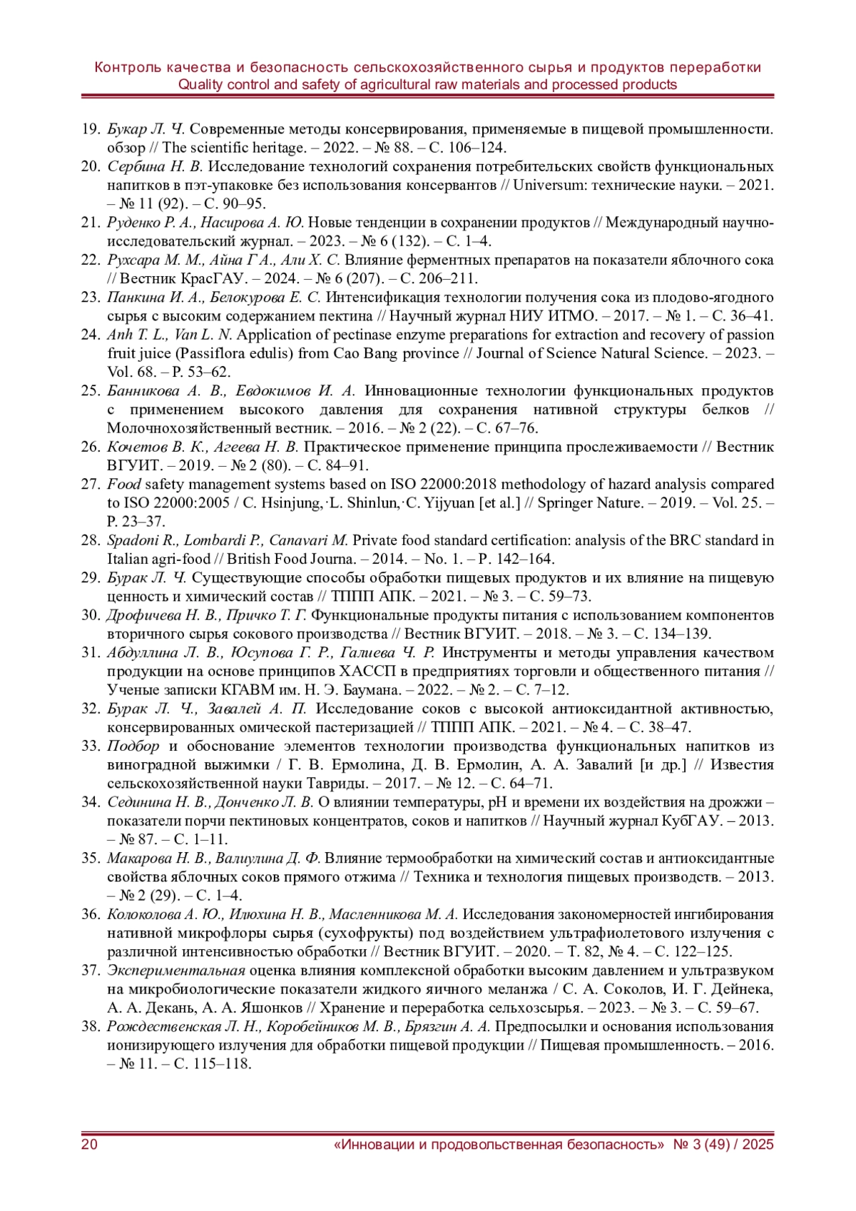 32. Бурак Л. Ч., Завалей А. П. Исследование соков с высокой антиоксидантной активностью, консервированных омической пастеризацией // ТППП АПК. - 2021. - № 4. - С. 38-47. EDN: EWHHTK