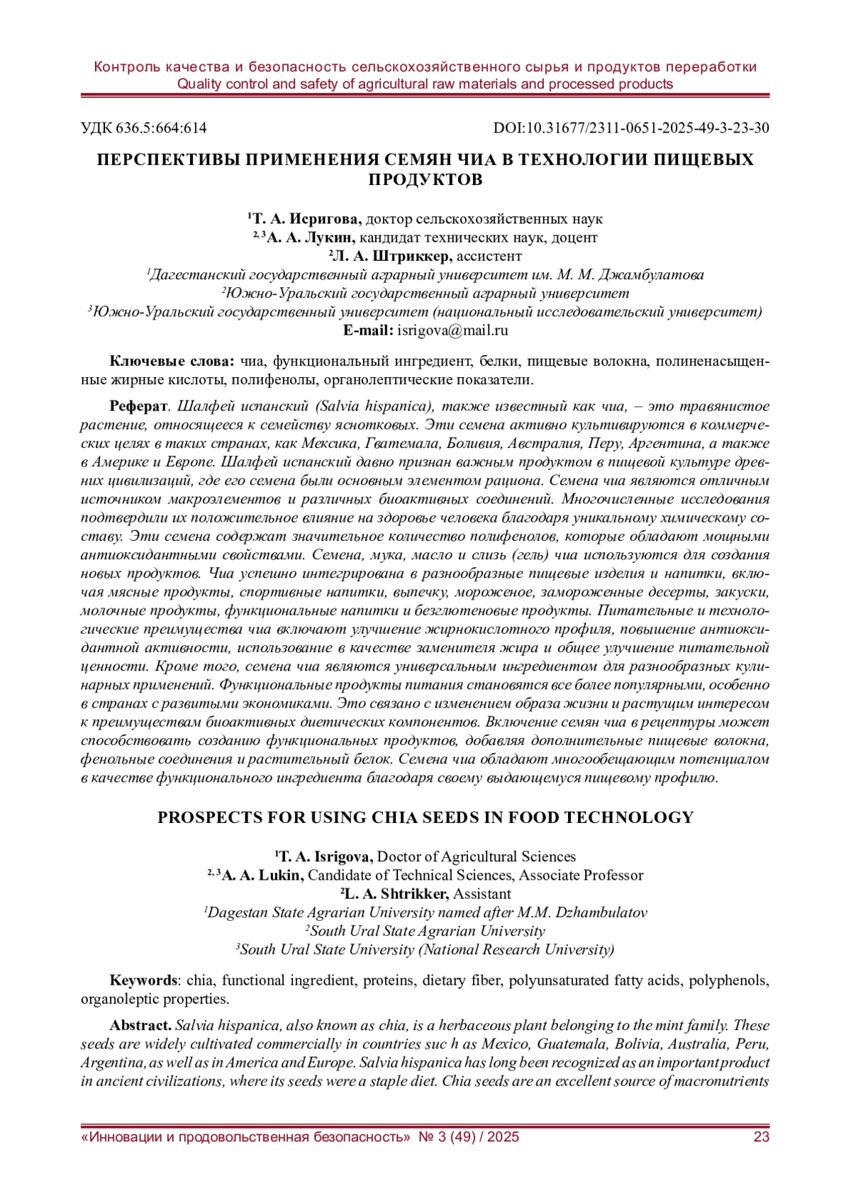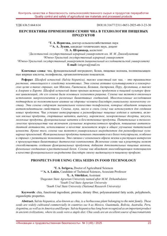 17. Naumova N., Lukin A., Erlikh V. Quality and nutritional value of pasta products with added ground chia seeds // Bulgarian Journal of Agricultural Science. - 2017. - No. 23 (5). - P. 860-865. EDN: PSKDJJ