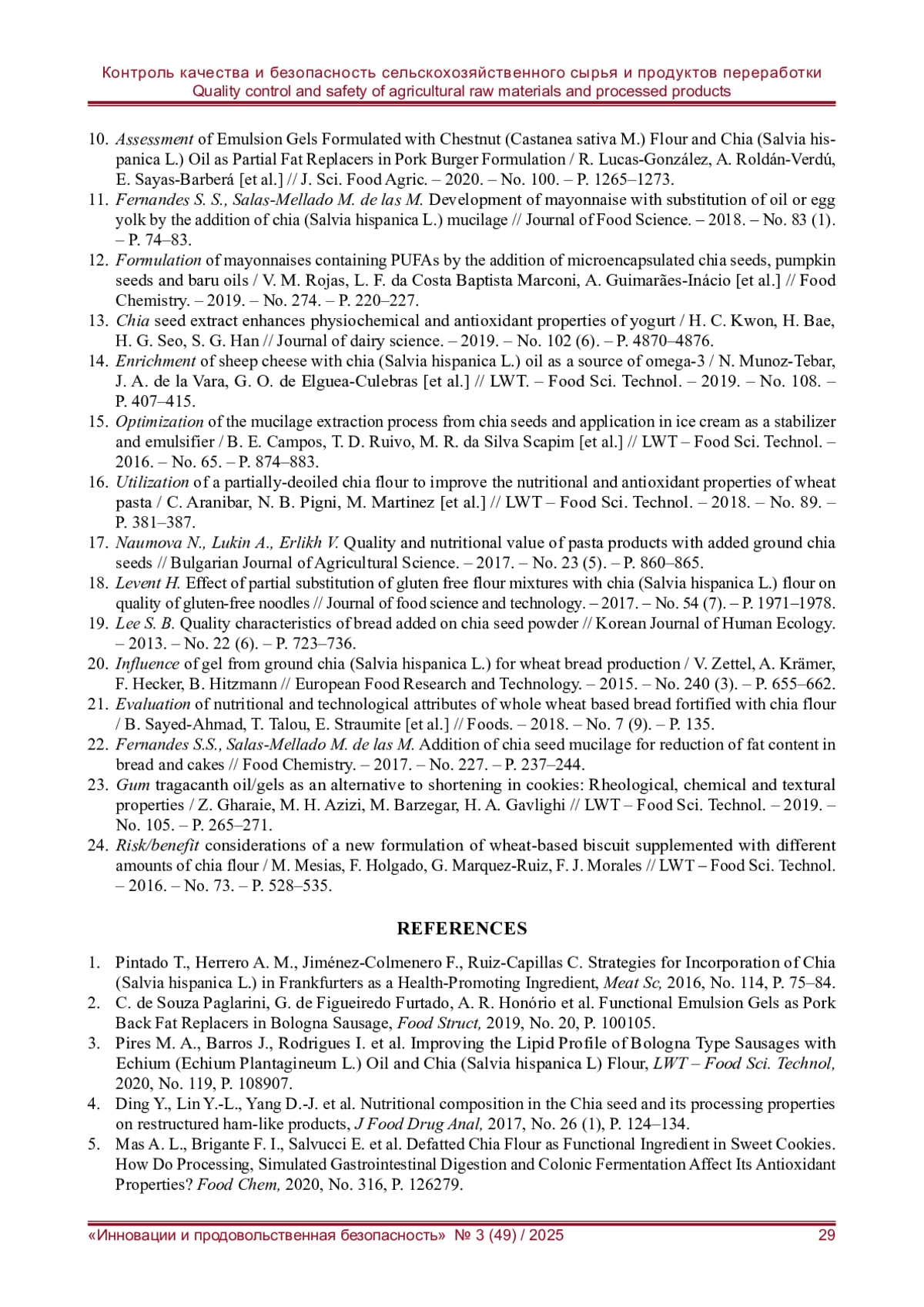 1. Strategies for Incorporation of Chia (Salvia hispanica L.) in Frankfurters as a Health-Promoting Ingredient / T. Pintado, A. M. Herrero, F. Jiménez-Colmenero, C.Ruiz-Capillas // Meat Sci. - 2016. - No. 114. - P. 75-84.