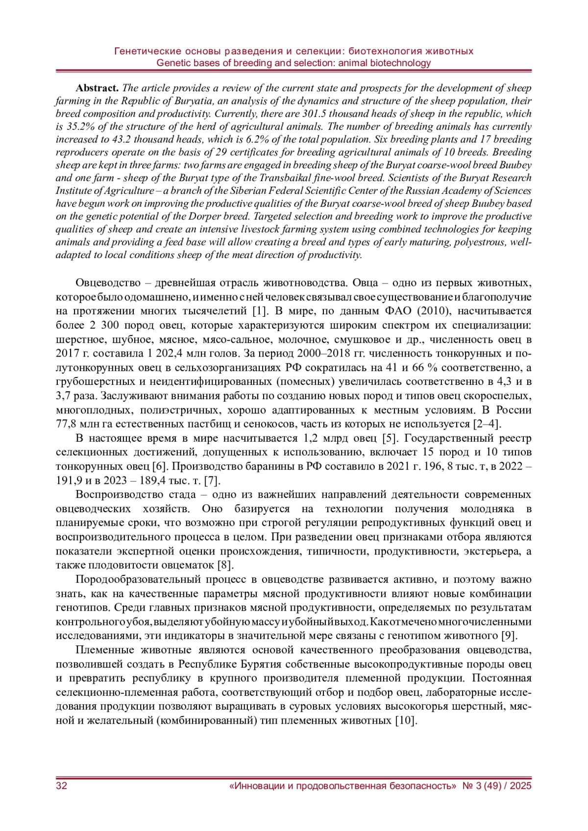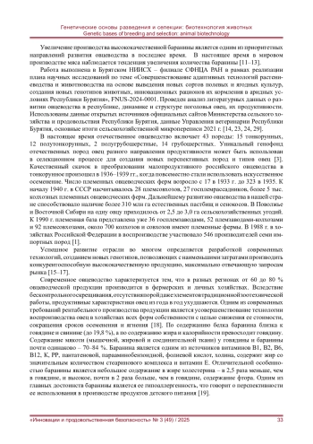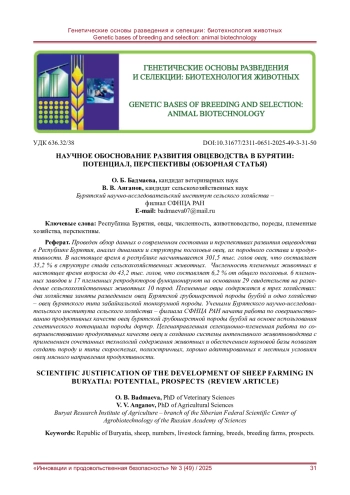 Проведен обзор данных о современном состоянии и перспективах развития овцеводства в Республике Бурятия, анализ динамики и структуры поголовья овец, их породного состава и продуктивности. В настоящее время в республике насчитывается 301,5 тыс. голов овец, что составляет 35,2 % в структуре стада сельскохозяйственных животных. Численность племенных животных в настоящее время возросла до 43,2 тыс. голов, что составляет 6,2 % от общего поголовья. 6 племенных заводов и 17 племенных репродукторов функционируют на основании 29 свидетельств на разведение сельскохозяйственных животных 10 пород. Племенные овцы содержатся в трех хозяйствах: два хозяйства заняты разведением овец Бурятской грубошерстной породы буубэй и одно хозяйство - овец Бурятского типа забайкальской тонкорунной породы. Учеными Бурятского научно-исследовательского института сельского хозяйства - филиала СФНЦА РАН начата работа по совершенствованию продуктивных качеств овец бурятской грубошерстной породы буубэй на основе использования генетического потенциала породы Дорпер. Целенаправленная селекционно-племенная работа по совершенствованию продуктивных качеств овец и созданию системы интенсивного животноводства с применением сочетанных технологий содержания животных и обеспечением кормовой базы позволят создать породу и типы скороспелых, полиэстричных, хорошо адаптированных к местным условиям овец мясного направления продуктивности.