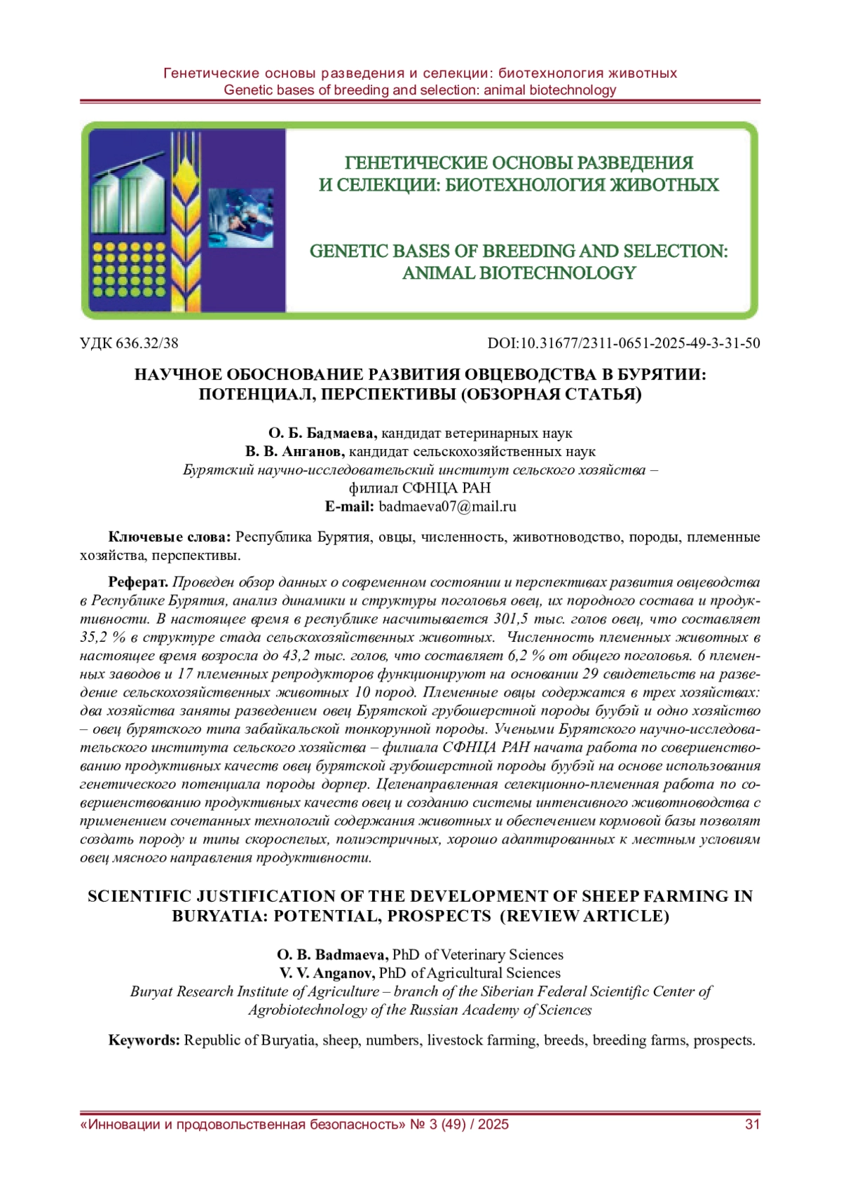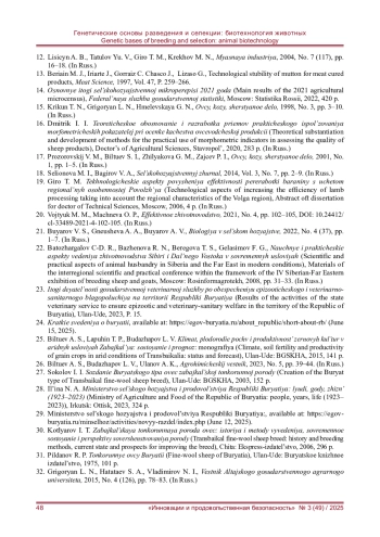 43. Билтуев С. И. Обоснование желательного типа сложных помесей при создании бурятской полугрубошерстной породы ове // Овцы, козы, шерстяное дело. - 2016. - № 3. - С. 8-12. EDN: WQSCPL