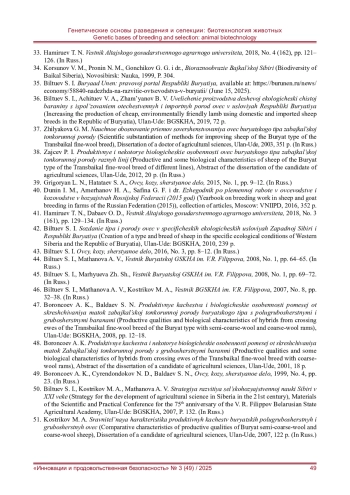 33. Хамируев Т. Н. Продуктивные и племенные качества тонкорунных овец забайкальской породы // Вестник Алтайского государственного аграрного университета. - 2018. - № 4 (162). - С. 121-126. EDN: XMZQGL