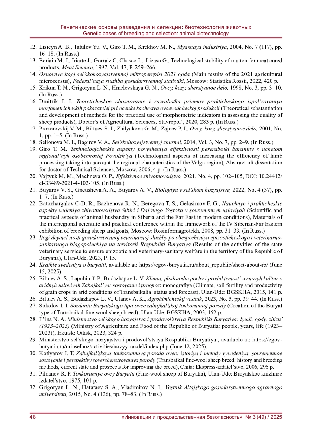 47. Боронцоев А. К., Балдаев С. Н. Продуктивные качества и биологические особенности помесей от скрещивания маток забайкальской тонкорунной породы бурятского типа с полугрубошерстными и грубошерстными баранами: монография. - Улан-Удэ: БГСХА, 2008. - С. 12-18.