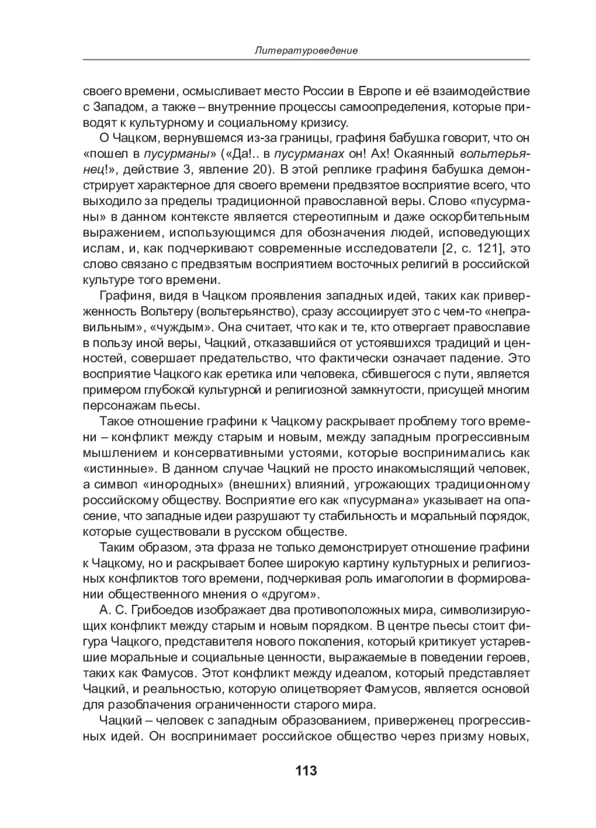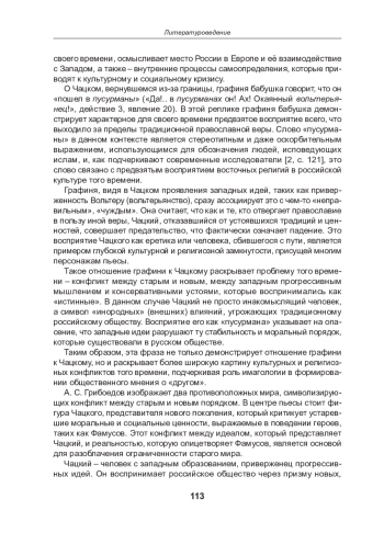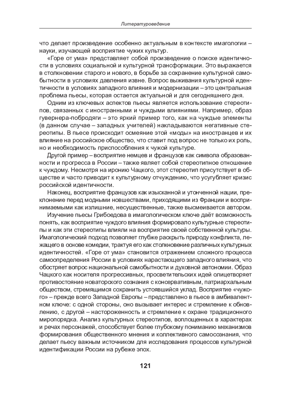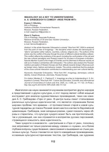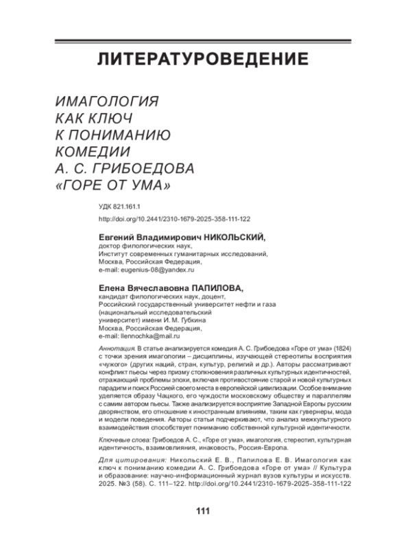 В статье анализируется комедия А. С. Грибоедова «Горе от ума» (1824) с точки зрения имагологии - дисциплины, изучающей стереотипы восприятия «чужого» (других наций, стран, культур, религий и др.). Авторы рассматривают конфликт пьесы через призму столкновения различных культурных идентичностей, отражающий проблемы эпохи, включая противостояние старой и новой культурных парадигм и поиск Россией своего места в европейской цивилизации. Особое внимание уделяется образу Чацкого, его чуждости московскому обществу и параллелям с самим автором пьесы. Также анализируется восприятие Западной Европы русским дворянством, его отношение к иностранным влияниям, таким как гувернеры, мода и модели поведения. Авторы статьи подчеркивают, что анализ межкультурного взаимодействия способствует пониманию собственной культурной идентичности
