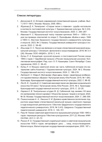 8. Лях В. И., Сигида Д. А. Советская массовая песня как феномен музыкального искусства ХХ века // Культурная жизнь Юга России. 2015, № 2. Краснодар: Краснодарский государственный институт культуры, 2015. С. 22-25. EDN: TZWUAD