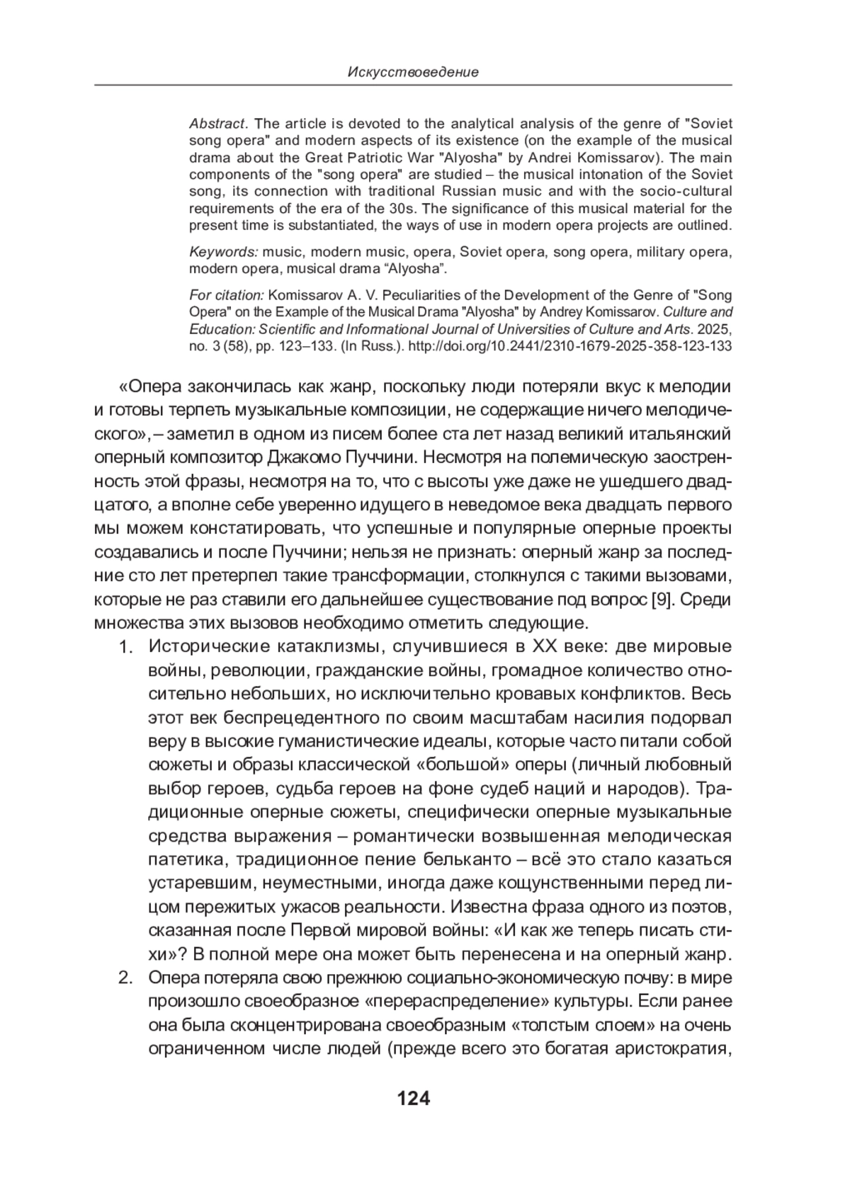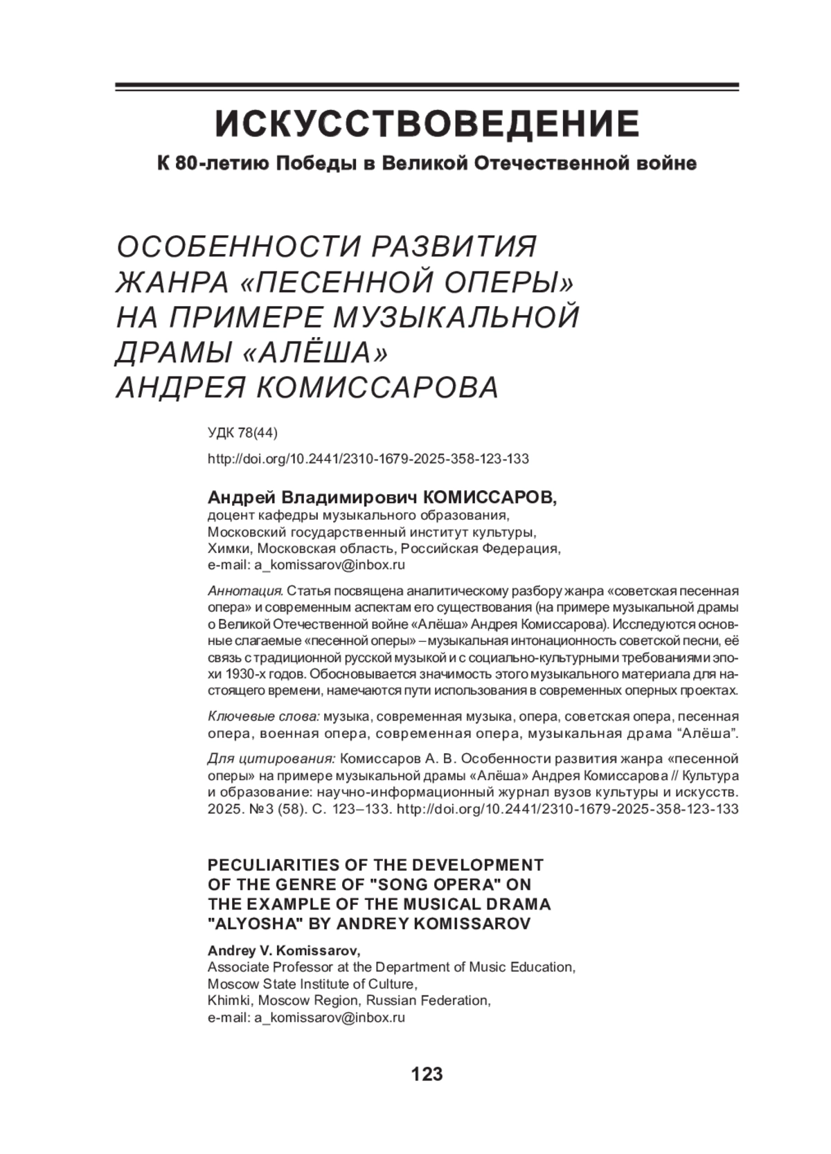 Статья посвящена аналитическому разбору жанра «советская песенная опера» и современным аспектам его существования (на примере музыкальной драмы о Великой Отечественной войне «Алёша» Андрея Комиссарова). Исследуются основные слагаемые «песенной оперы» музыкальная интонационность советской песни, её связь с традиционной русской музыкой и с социально культурными требованиями эпохи 1930 х годов. Обосновывается значимость этого музыкального материала для настоящего времени, намечаются пути использования в современных оперных проектах.
