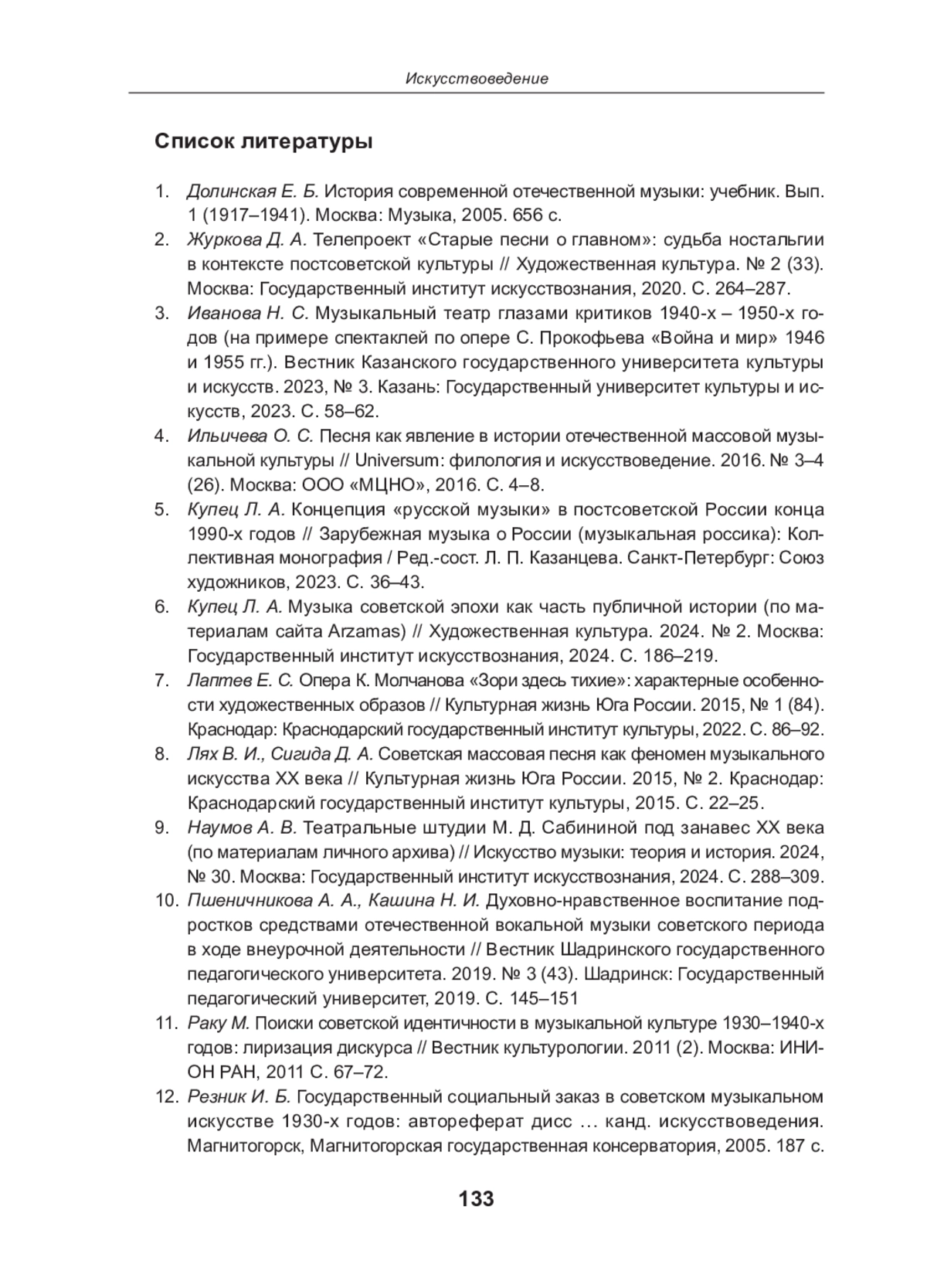 6. Купец Л. А. Музыка советской эпохи как часть публичной истории (по материалам сайта Arzamas) // Художественная культура. 2024. № 2. Москва: Государственный институт искусствознания, 2024. С. 186-219. EDN: KWRNUL