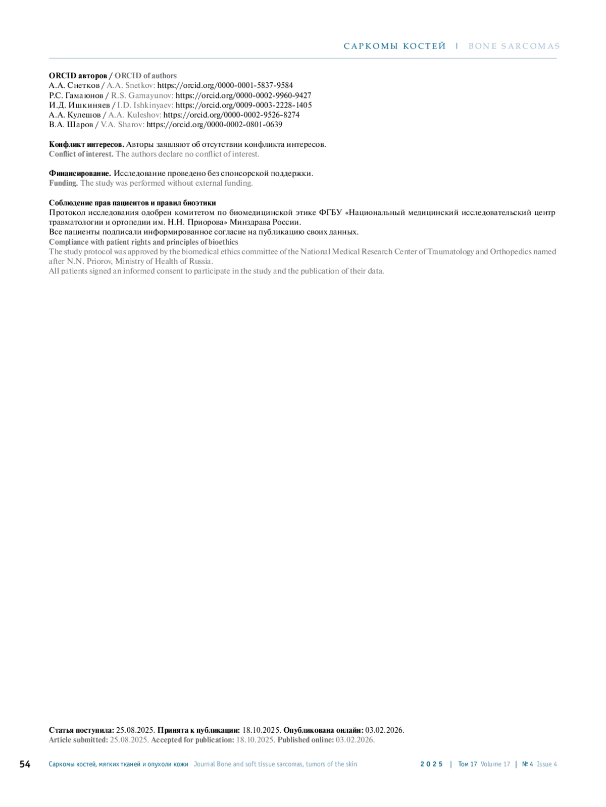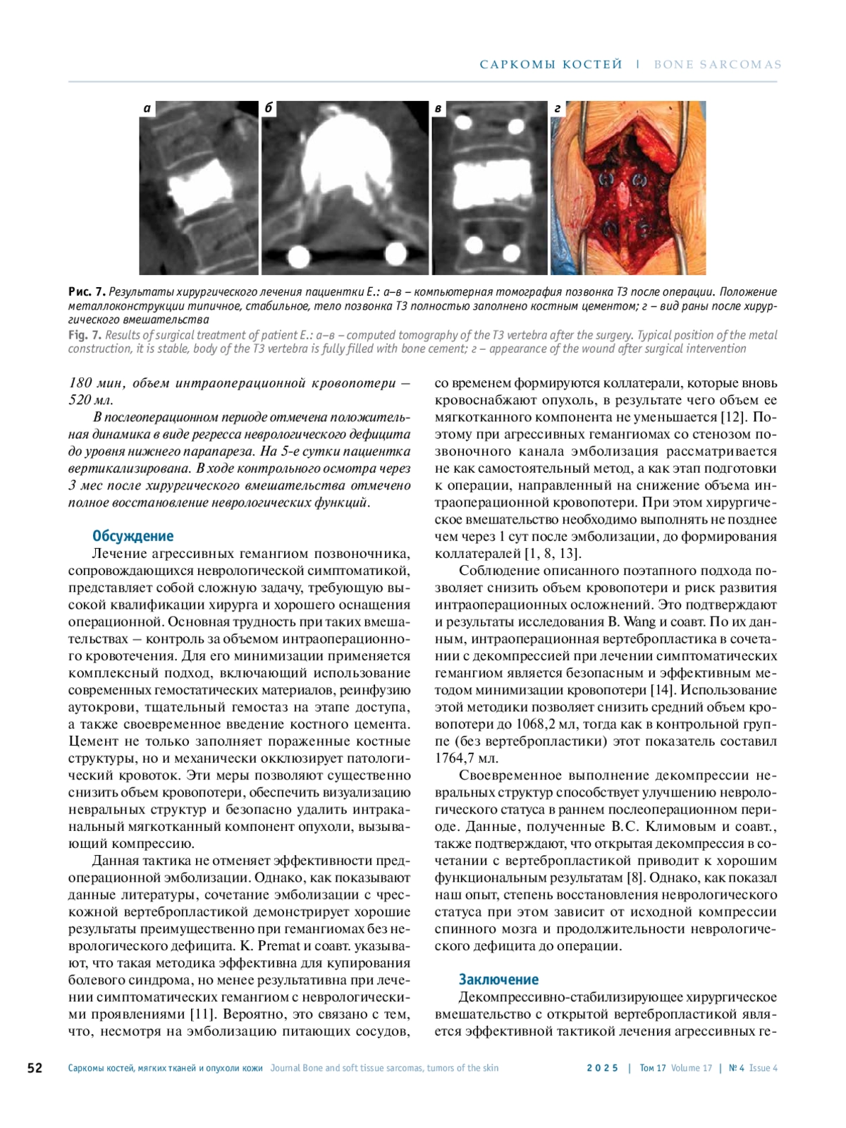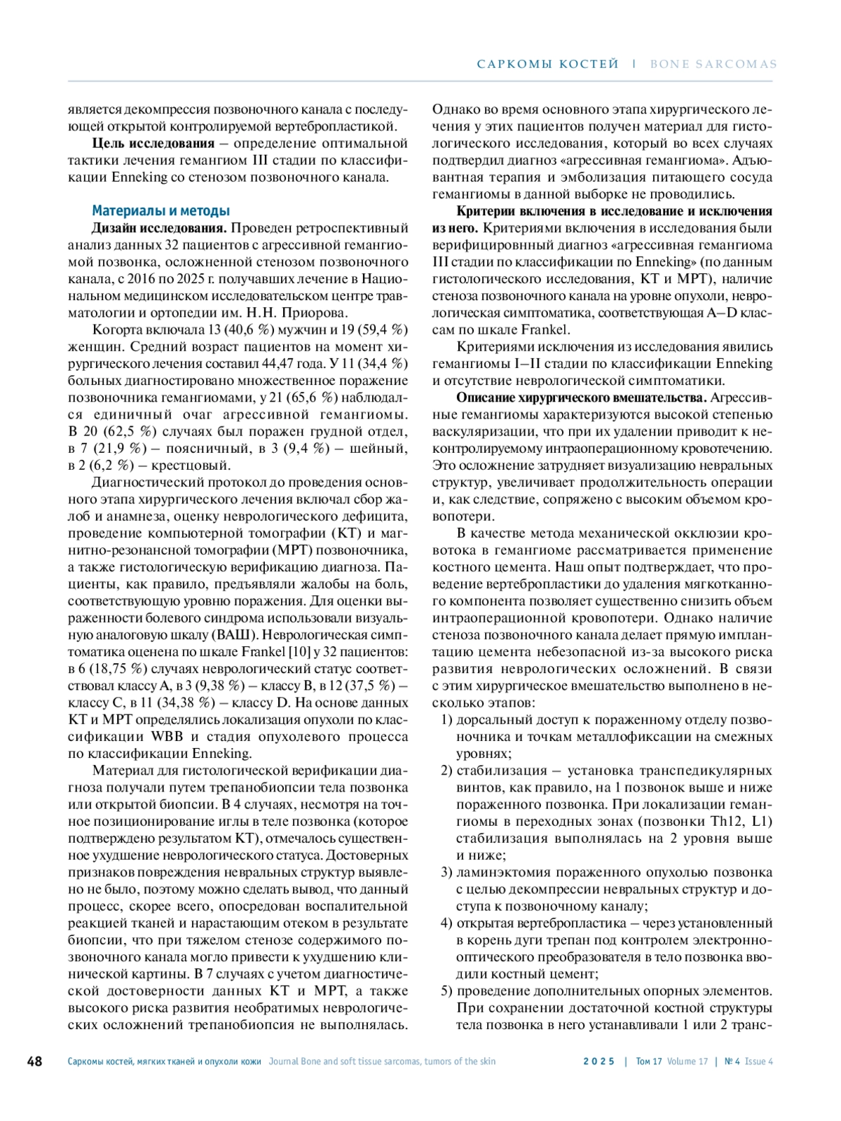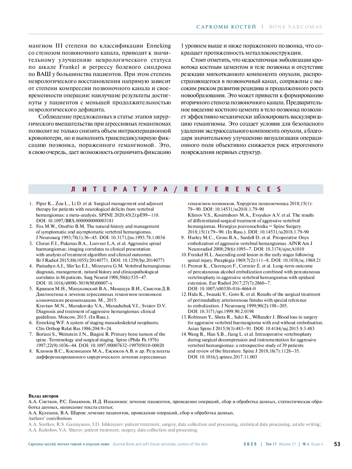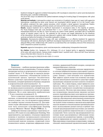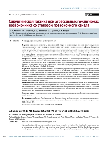 СНЕТКОВ А. А., ГАМАЮНОВ Р. С., ИШКИНЯЕВ И. Д., КУЛЕШОВ А. А., ШАРОВ В. А. ХИРУРГИЧЕСКАЯ ТАКТИКА ПРИ АГРЕССИВНЫХ ГЕМАНГИОМАХ ПОЗВОНОЧНИКА СО СТЕНОЗОМ ПОЗВОНОЧНОГО КАНАЛА // САРКОМЫ КОСТЕЙ, МЯГКИХ ТКАНЕЙ И ОПУХОЛИ КОЖИ. 2025. № 4, ТОМ 17