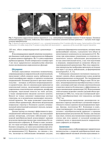 Заключение. Декомпрессивно-стабилизирующее вмешательство с открытой вертебропластикой является эффективным методом лечения агрессивных гемангиом со стенозом, позволяющим добиться значительного улучшения неврологического статуса и купирования болевого синдрома. Ключевыми факторами успеха являются адекватное заполнение тела позвонка цементом для окклюзии кровотока и обязательное удаление экстраоссального компонента опухоли для предотвращения развития рецидива.