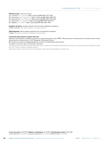 Журнал: САРКОМЫ КОСТЕЙ, МЯГКИХ ТКАНЕЙ И ОПУХОЛИ КОЖИ