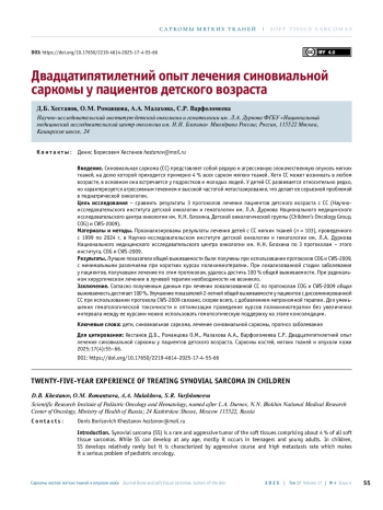 Введение. Синовиальная саркома (СС) представляет собой редкую и агрессивную злокачественную опухоль мягких тканей, на долю которой приходится примерно 4 % всех сарком мягких тканей. Хотя СС может возникать в любом возрасте, в основном она встречается у подростков и молодых людей. У детей СС развивается относительно редко, но характеризуется агрессивным течением и высокой частотой метастазирования, что делает ее серьезной проблемой в педиатрической онкологии.