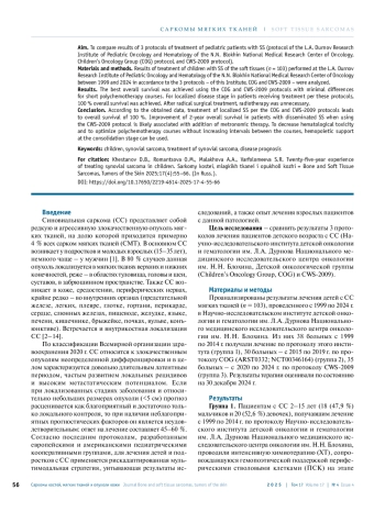25. Venkatramani R., Xue W., Randall R.L. et al. Synovial sarcoma in children, adolescents, and young adults: a report from the Children’s Oncology Group ARST0332 Study. J Clin Oncol 2021;39(35):3927-37. DOI: 10.1200/JCO.21.01628.