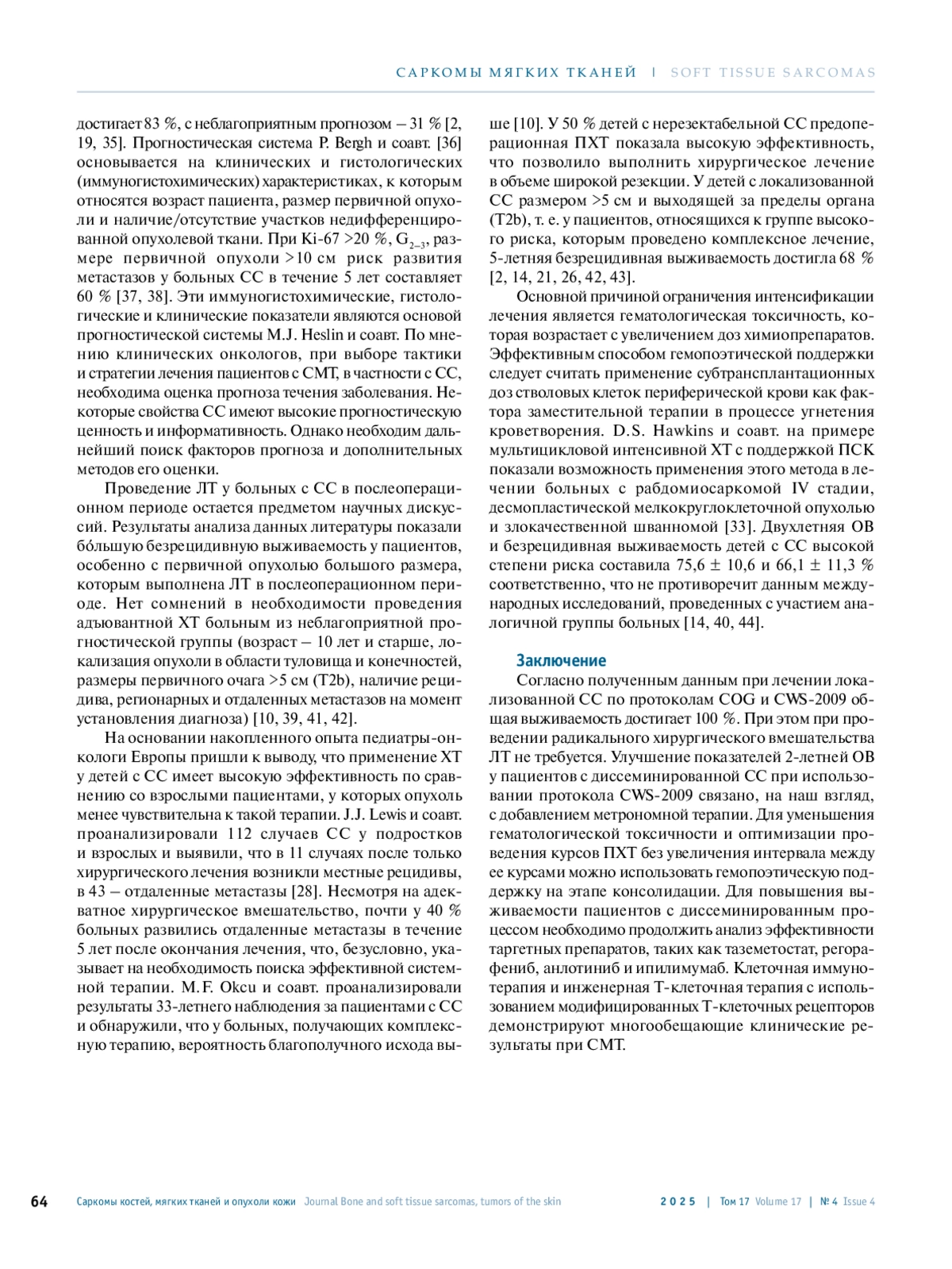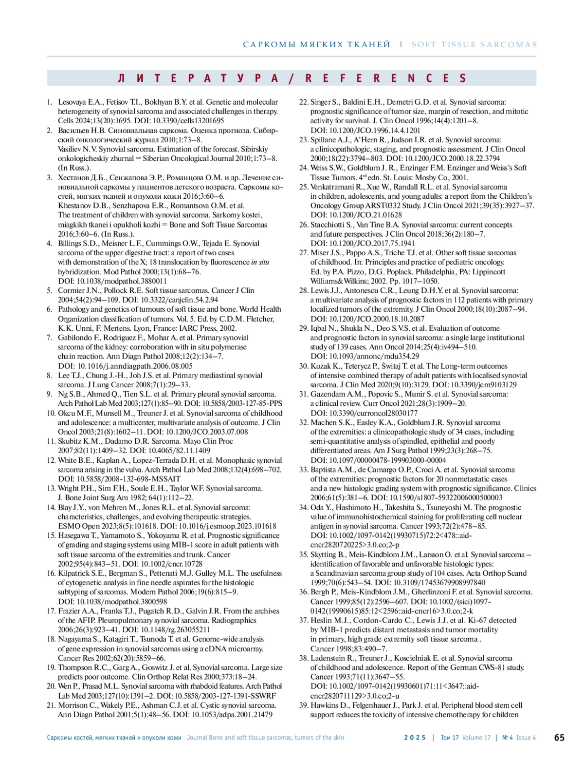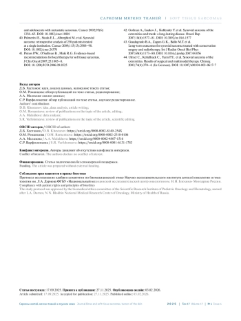 40. Palmerini E., Staals E.L., Alberghini M. et al. Synovial sarcoma: retrospective analysis of 250 patients treated at a single institution. Сancer 2009;115(13):2988-98. DOI: 10.1002/cncr.24370.