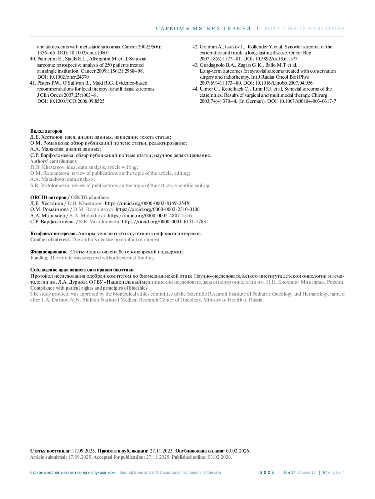44. Ulmer C., Kettelhack C., Tunn P.U. et al. Synovial sarcoma of the extremities. Results of surgical and multimodal therapy. Chirurg 2003;74(4):370-4. (In German). DOI: 10.1007/s00104-003-0617-7.