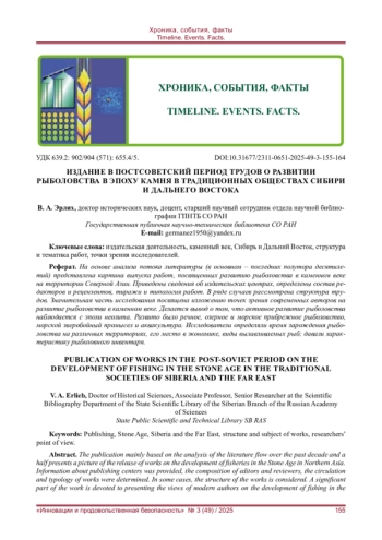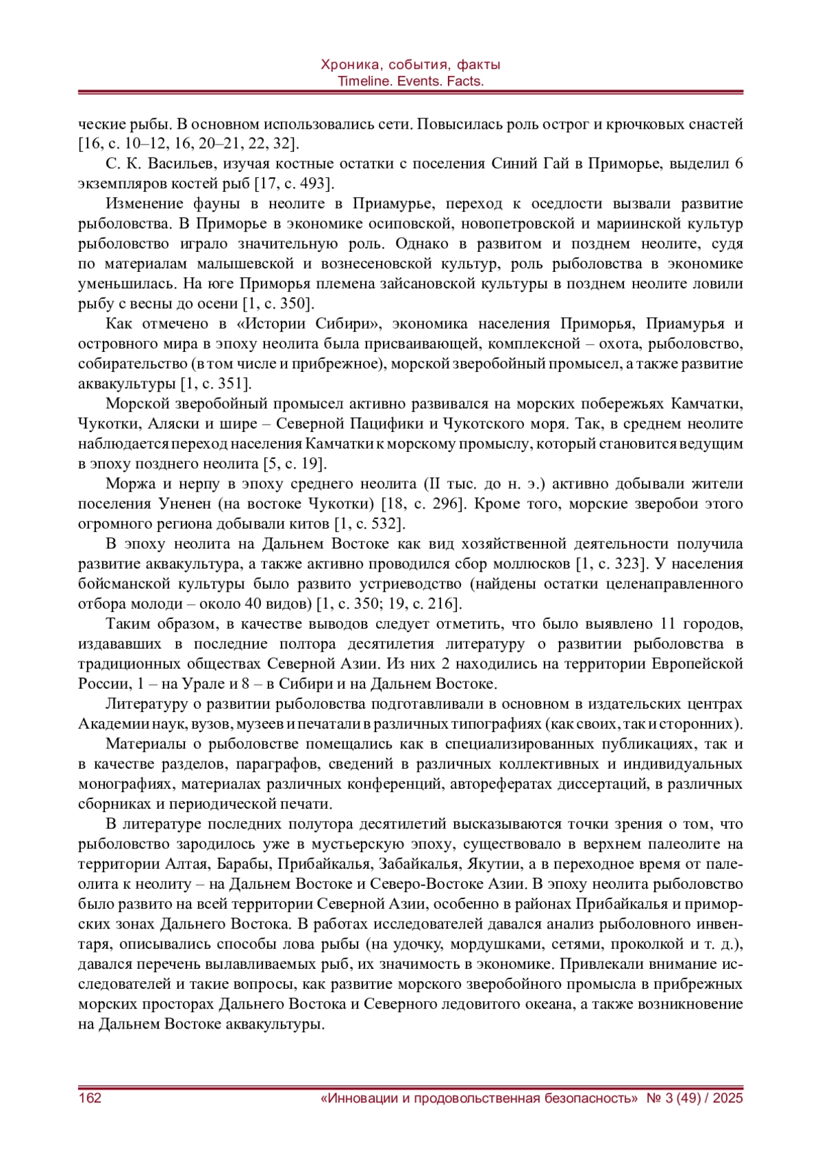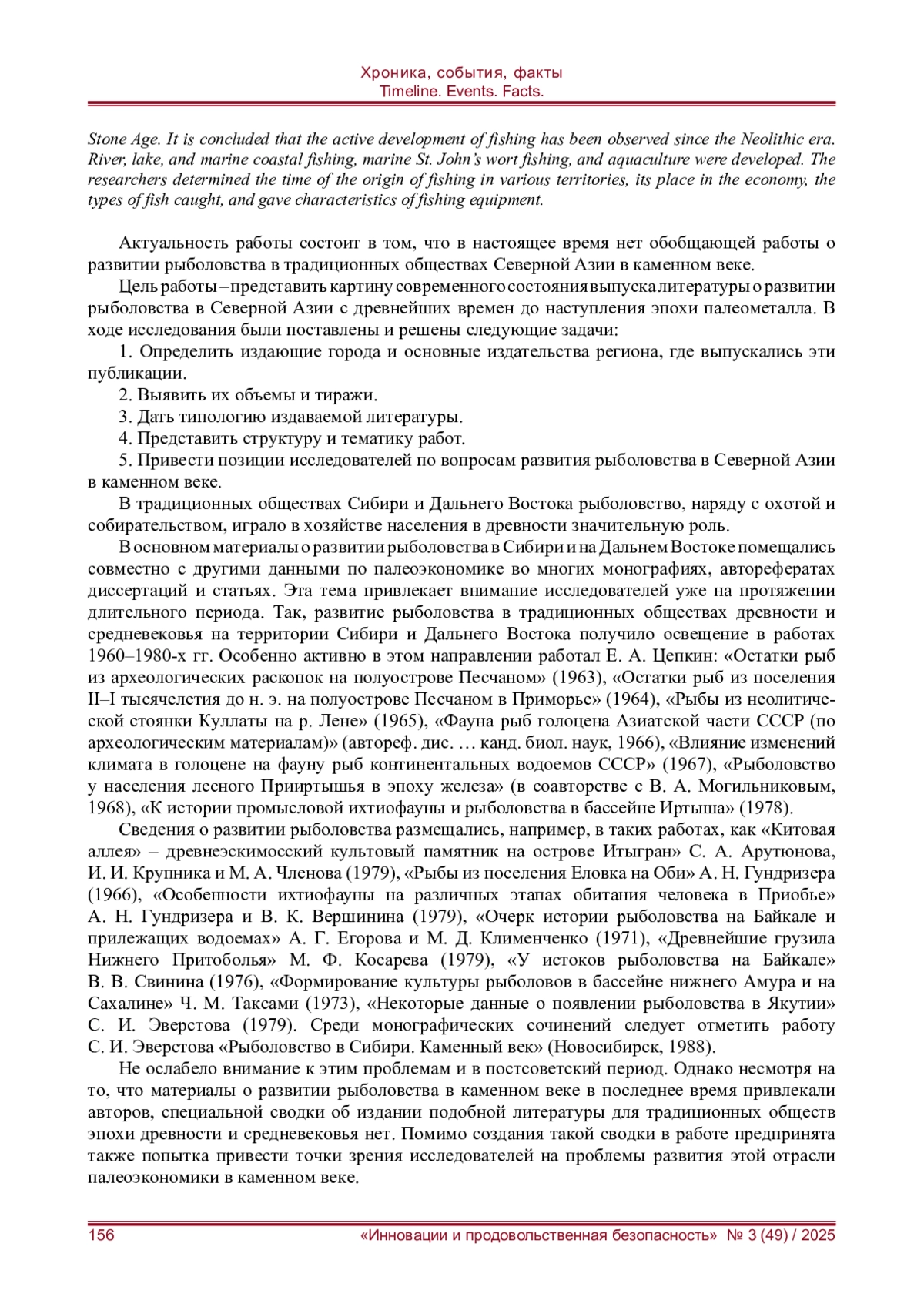 На основе анализа потока литературы (в основном - последних полутора десятилетий) представлена картина выпуска работ, посвященных развитию рыболовства в каменном веке на территории Северной Азии. Приведены сведения об издательских центрах, определены состав редакторов и рецензентов, тиражи и типология работ. В ряде случаев рассмотрена структура трудов. Значительная часть исследования посвящена изложению точек зрения современных авторов на развитие рыболовства в каменном веке. Делается вывод о том, что активное развитие рыболовства наблюдается с эпохи неолита. Развито было речное, озерное и морское прибрежное рыболовство, морской зверобойный промысел и аквакультура. Исследователи определяли время зарождения рыболовства на различных территориях, его место в экономике, виды вылавливаемых рыб; давали характеристику рыболовного инвентаря.