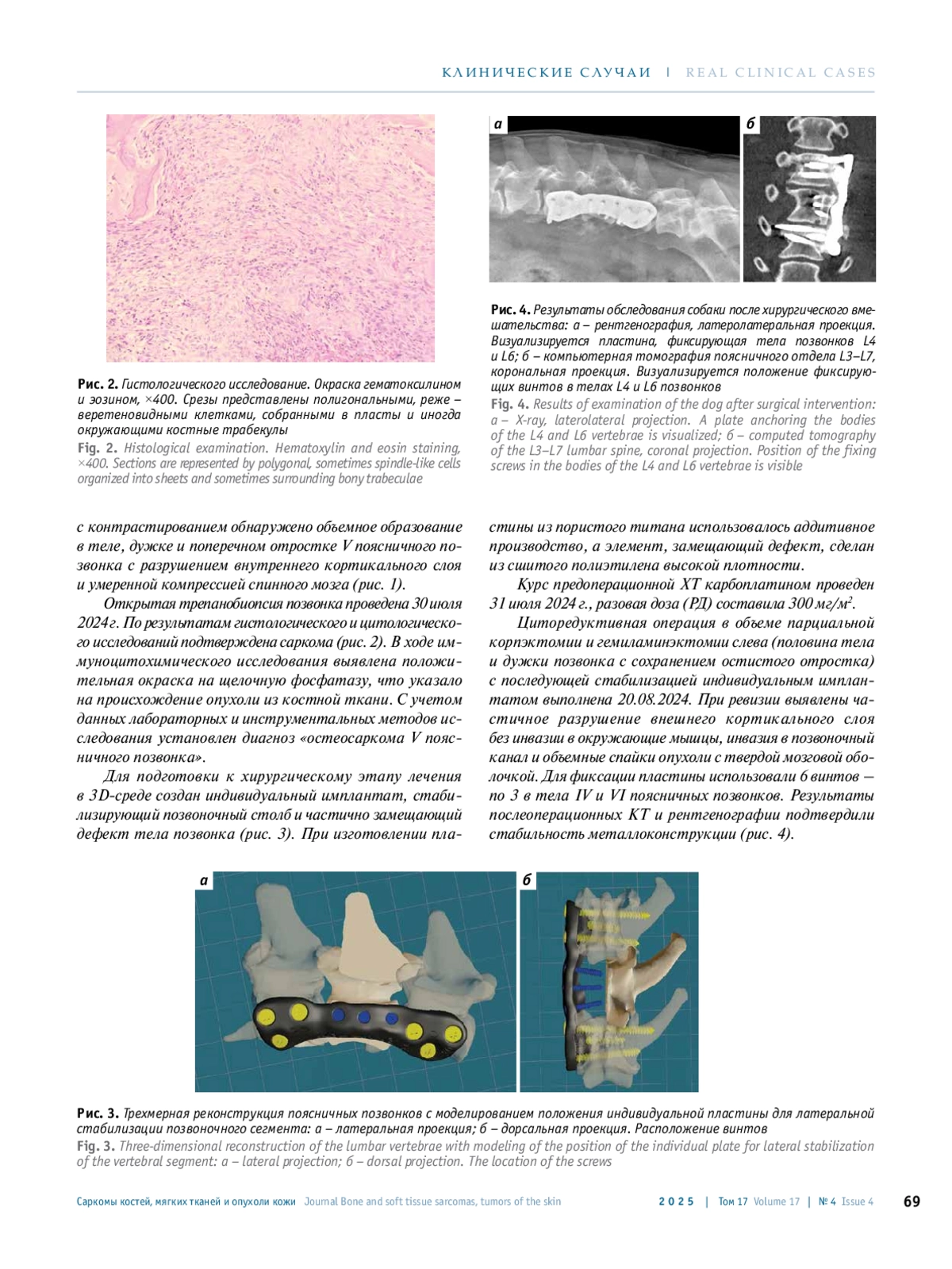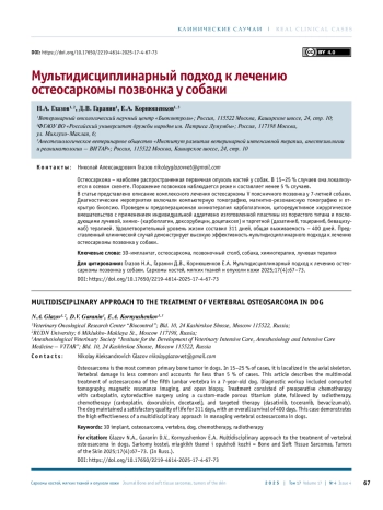 Остеосаркома (ОС) – наиболее часто встречающаяся первичная опухоль костей у собак [1, 2]. Она поражает аппендикулярный скелет в 75–85 % случаев, осевой – в 15–25 % [3, 4]. Вертебральная локализация опухоли не превышает 5 % [5]. Годовая распространенность ОС по общему поголовью собак составляет 0,037 % [6]. Прогноз без лечения неблагоприятный. Медиана выживаемости собак при поражении позвоночного столба без терапии составляет до 30 дней, при проведении хирургического лечения – 38, хирургического вмешательства с химиотерапией (ХТ) и лучевой терапией (ЛТ) – 261 день [7]. Лечение ОС при поражении позвонка представляет сложность для ветеринарных врачей. Кроме стандартных системных нарушений, характерных для данной опухоли, она оказывает прямое компрессионное воздействие на спинной мозг, вызывая быстро прогрессирующую неврологическую симптоматику и приводит к полной инвалидизации [7].