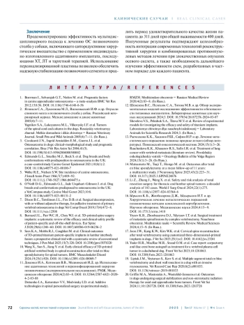 10. Wang X., Sun S., Jiang Y. et al. Early clinical efficacy of 3D-printed artificial vertebral body in spinal reconstruction after total en bloc spondylectomy for spinal tumors. BMC Musculoskelet Disord 2024;19;25(1):926. DOI: 10.1186/s12891-024-08069-7.
