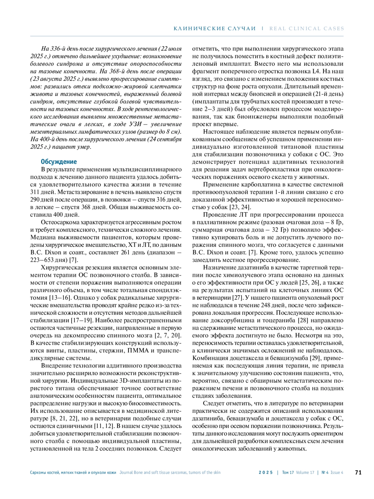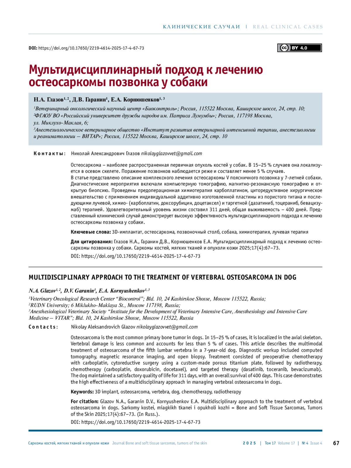 В статье представлено описание комплексного лечения остеосаркомы V поясничного позвонка у 7-летней собаки. Диагностические мероприятия включали компьютерную томографию, магнитно-резонансную томографию и открытую биопсию. Проведены предоперационная химиотерапия карбоплатином, циторедуктивное хирургическое вмешательство с применением индивидуальной аддитивно изготовленной пластины из пористого титана и последующими лучевой, химио- (карбоплатин, доксорубицин, доцетаксел) и таргетной (дазатиниб, тоцераниб, бевацизумаб) терапией. Удовлетворительный уровень жизни составил 311 дней, общая выживаемость – 400 дней. Представленный клинический случай демонстрирует высокую эффективность мультидисциплинарного подхода к лечению остеосаркомы позвонка у собаки.