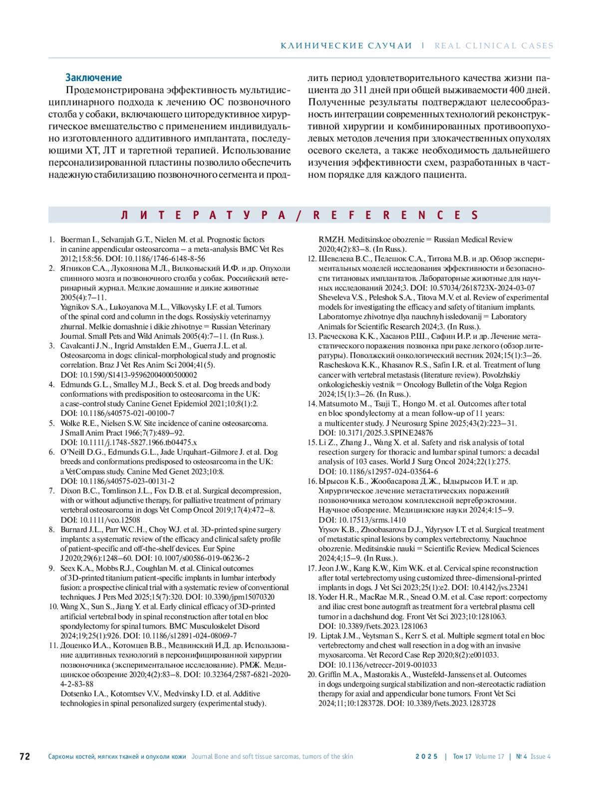 22. Li Z., Li Z., Zhu L. et al. The application of 3D printing technology in the reconstruction of the spine following total en bloc spondylectomy for spinal tumors: case report and literature review. J Orthop Surg Res 2024;19(1):342. DOI: 10.1186/s13018-024-04827-4.