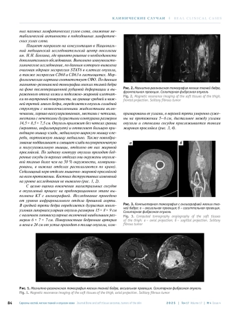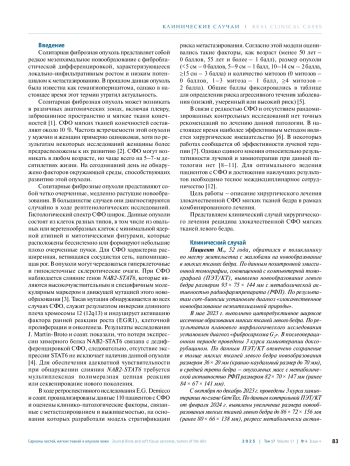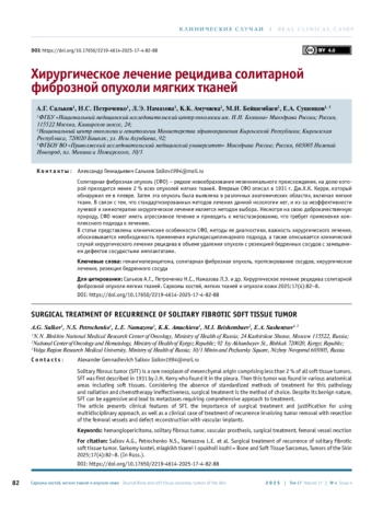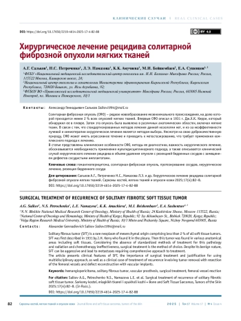 Солитарная фиброзная опухоль (СФО) – редкое новообразование мезенхимального происхождения, на долю которой приходится менее 2 % всех опухолей мягких тканей. Впервые СФО описал в 1931 г. Дж. Х. К. Керри, который обнаружил ее в плевре. Затем эта опухоль была выявлена в различных анатомических областях, включая мягкие ткани. В связи с тем, что стандартизированных методов лечения данной нозологии нет, и из-за неэффективности лучевой и химиотерапии хирургическое лечение является методом выбора. Несмотря на свою доброкачественную природу, СФО может иметь агрессивное течение и приводить к метастазированию, что требует применения комплексного подхода к лечению.