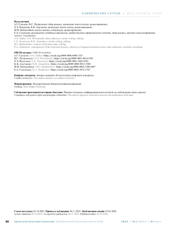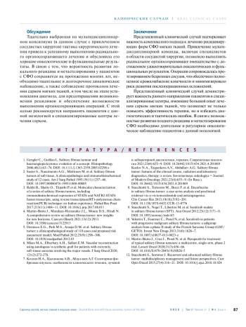 Заключение. Мультивисцеральные резекции с реконструкцией магистральных сосудов при неорганных забрюшинных саркомах улучшают показатели выживаемости и снижают частоту развития локальных рецидивов. Планирование и выполнение таких хирургических вмешательств требуют мультидисциплинарного подхода. Несмотря на получение обнадеживающих результатов, ряд фундаментальных аспектов проблемы остается нерешенным и требует дальнейшего изучения.