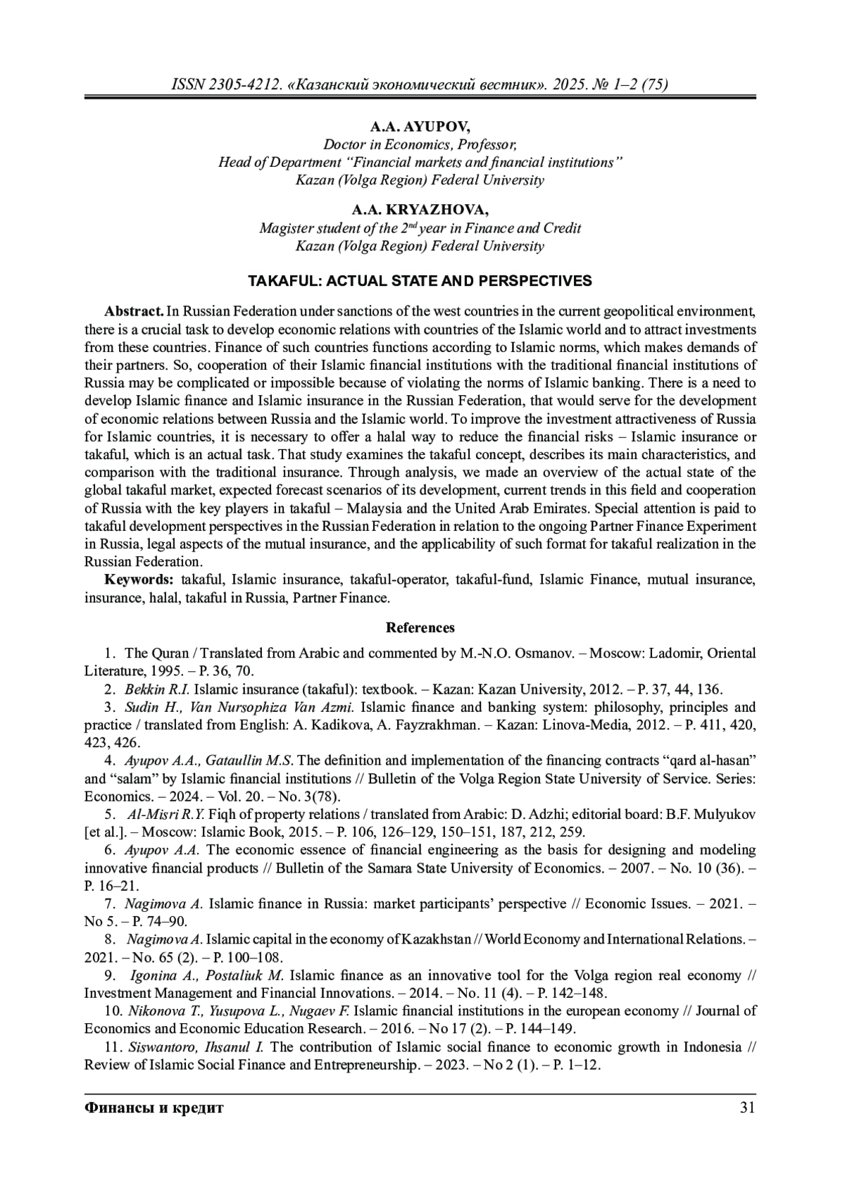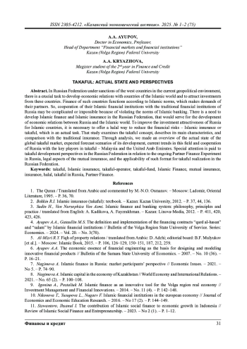 4. Аюпов А.А., Гатауллин М.С. Дефиниция и реализация договоров финансирования “кард аль-ха-сан” и “салям” исламскими финансовыми институтами // Вестник Поволжского государственного университета сервиса. Серия: Экономика. 2024. Т. 20. № 3(78). C. 32.