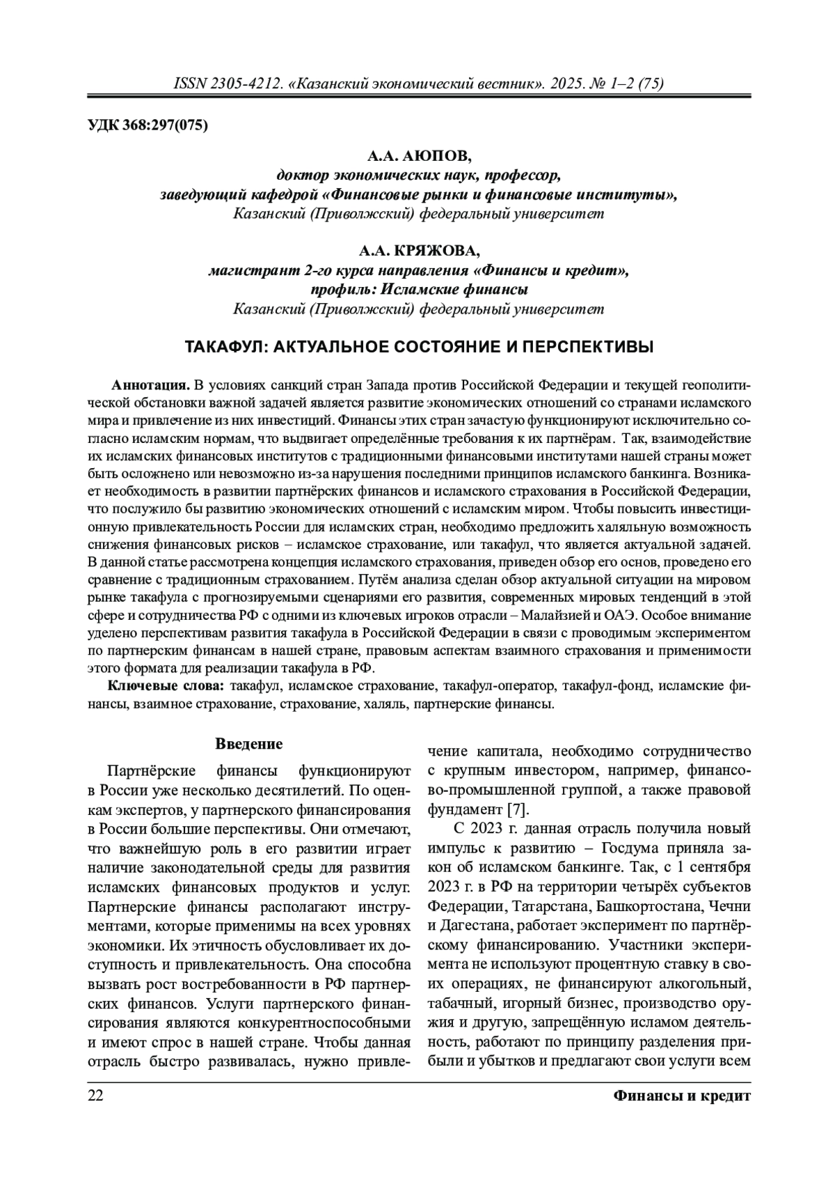 В условиях санкций стран Запада против Российской Федерации и текущей геополитической обстановки важной задачей является развитие экономических отношений со странами исламского мира и привлечение из них инвестиций. Финансы этих стран зачастую функционируют исключительно согласно исламским нормам, что выдвигает определённые требования к их партнёрам. Так, взаимодействие их исламских финансовых институтов с традиционными финансовыми институтами нашей страны может быть осложнено или невозможно из-за нарушения последними принципов исламского банкинга. Возникает необходимость в развитии партнёрских финансов и исламского страхования в Российской Федерации, что послужило бы развитию экономических отношений с исламским миром. Чтобы повысить инвестиционную привлекательность России для исламских стран, необходимо предложить халяльную возможность снижения финансовых рисков – исламское страхование, или такафул, что является актуальной задачей.