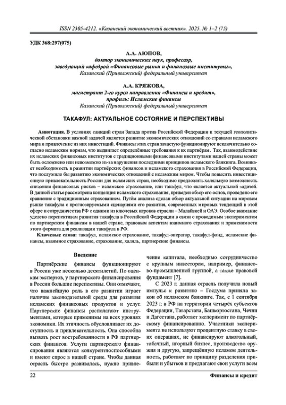 В данной статье рассмотрена концепция исламского страхования, приведен обзор его основ, проведено его сравнение с традиционным страхованием. Путём анализа сделан обзор актуальной ситуации на мировом рынке такафула с прогнозируемыми сценариями его развития, современных мировых тенденций в этой сфере и сотрудничества РФ с одними из ключевых игроков отрасли – Малайзией и ОАЭ. Особое внимание уделено перспективам развития такафула в Российской Федерации в связи с проводимым экспериментом по партнерским финансам в нашей стране, правовым аспектам взаимного страхования и применимости этого формата для реализации такафула в РФ.
