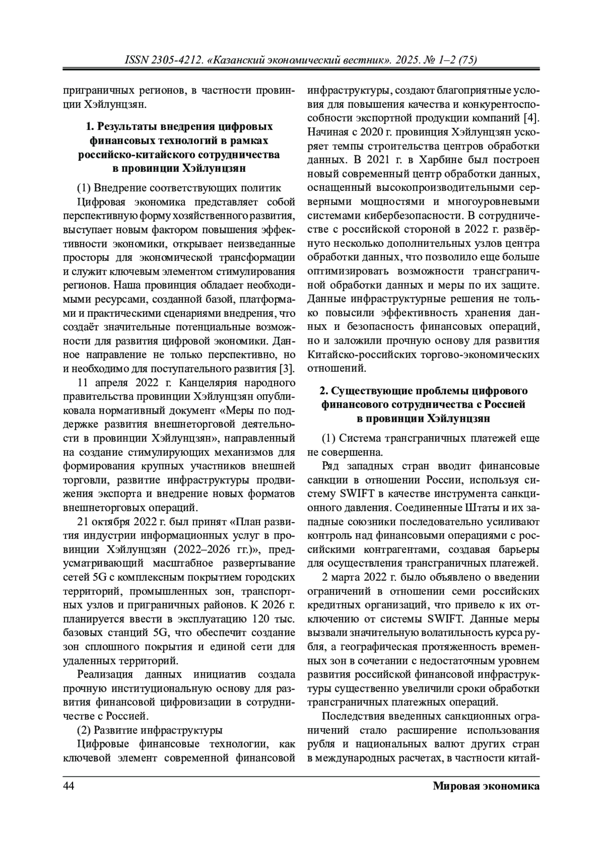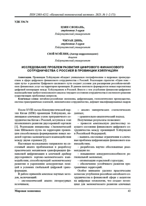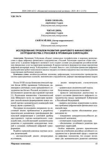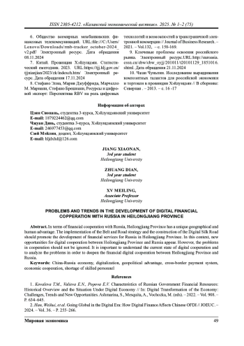 Провинция Хэйлунцзян обладает уникальным географическим и кадровым преимуществом в сфере цифрового финансового сотрудничества с Россией. Реализация стратегии «Один пояс - один путь» и развитие Цифрового шелкового пути создают условия для расширения российско-китайских финансовых услуг на территории провинции. В данном контексте формируются новые перспективы цифровой кооперации между Хэйлунцзяном и Россией. Вместе с тем углубление финансово цифрового взаимодействия требует комплексного анализа текущего состояния сотрудничества и системного решения существующих проблемных вопросов.