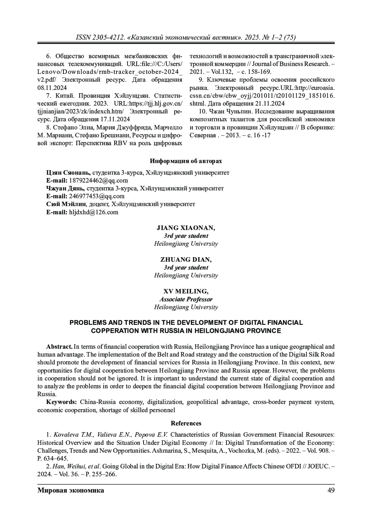 2. Han, Weihui, et al. Going Global in the Digital Era: How Digital Finance Affects Chinese OFDI // JOEUC. - 2024. - Vol.36, - pp. 255-266.