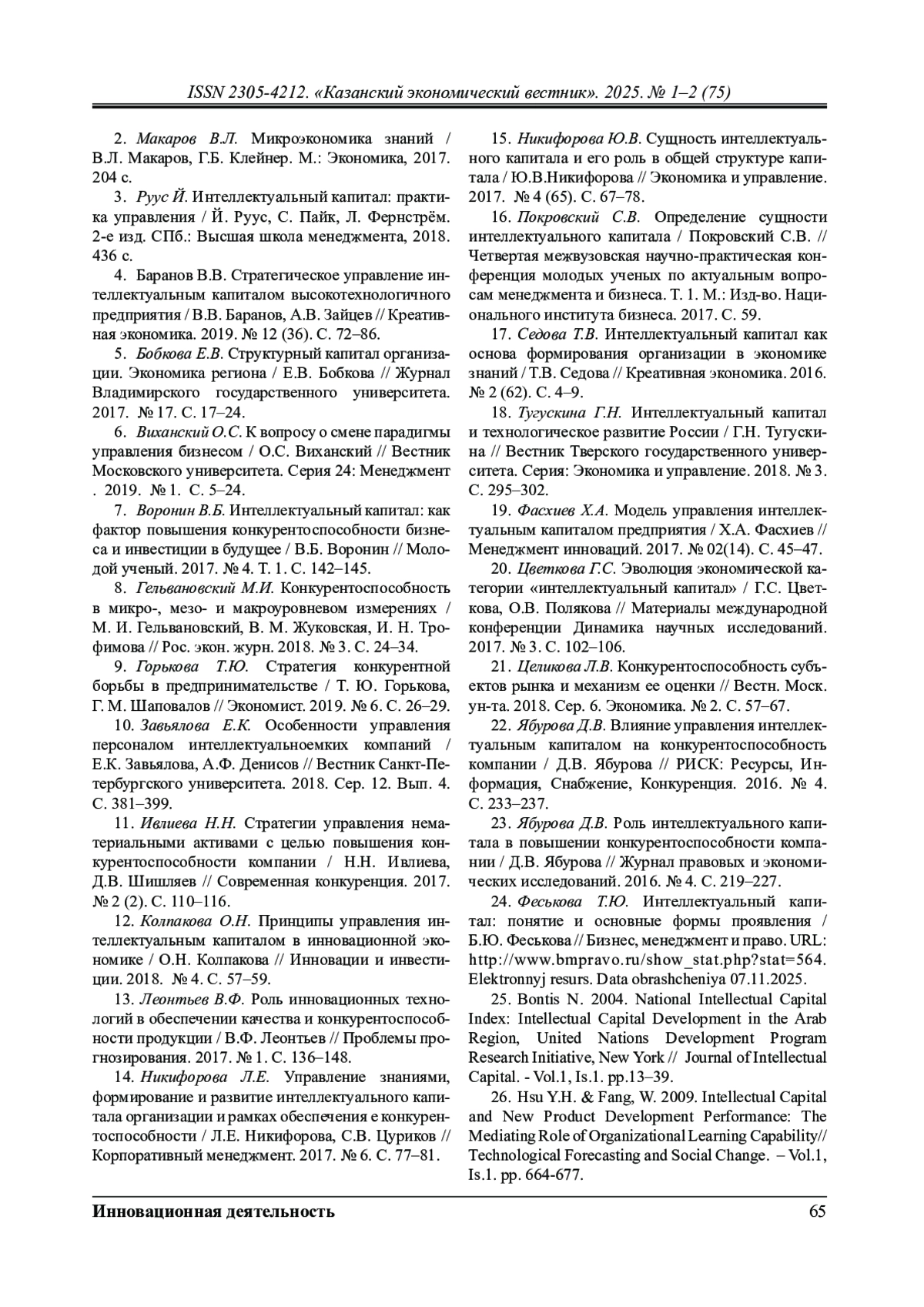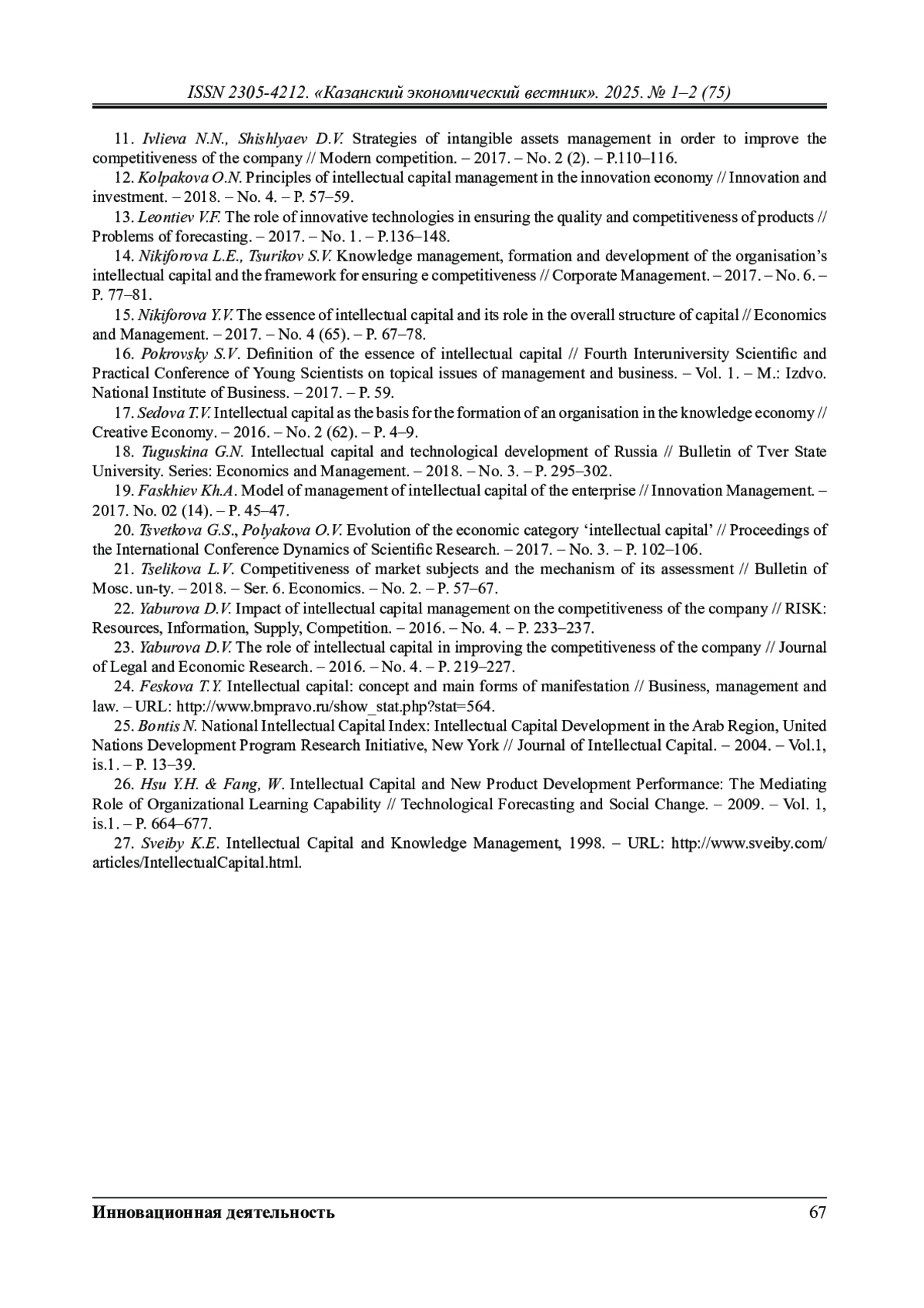 26. Феськова Т.Ю. Интеллектуальный капитал: понятие и основные формы проявления / Б.Ю. Феськова // Бизнес, менеджмент и право. URL: http://www.bmpravo.ru/show_stat.php?stat=564. Elektronnyj resurs. Data obrashcheniya 07.11.2025.