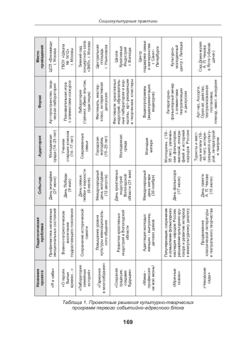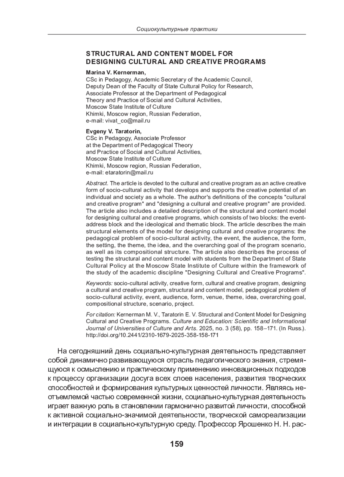 Статья посвящена культурно творческой программе как активной творческой форме социально культурной деятельности, развивающей и поддерживающей творческий потенциал личности и общества в целом. Приведены авторские определения понятий «культурно творческая программа» и «проектирование культурно творческой программы». Особое место в статье занимает подробное описание структурно содержательной модели проектирования культурно творческих программ, состоящей из двух блоков: событийно адресного и идейно тематического. Дана характеристика основным структурным элементам модели проектирования культурно творческих программ педагогической проблеме социально культурной деятельности, событию, аудитории, форме, месту действия, теме, идее и сверхзадаче сценария программы, его композиционному построению. Описывается процесс апробации структурно содержательной модели со студентами факультета государственной культурной политики Московского государственного института культуры в рамках изучения учебной дисциплины «Проектирование культурно творческих программ».