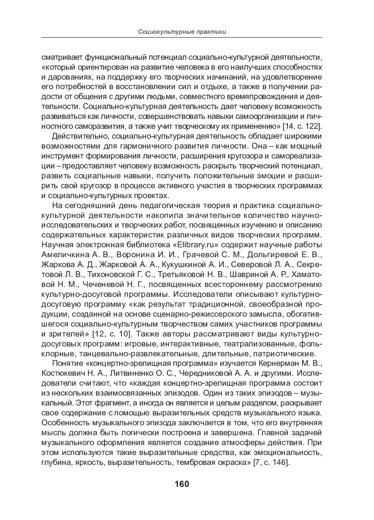 14. Ярошенко Н. Н. Потенциал социально культурной деятельности в процессе формирования национальной идентичности россиян // Вестник Московского государственного университета культуры и искусств. 2014. № 4 (60). С. 70-78. EDN: SQISQX