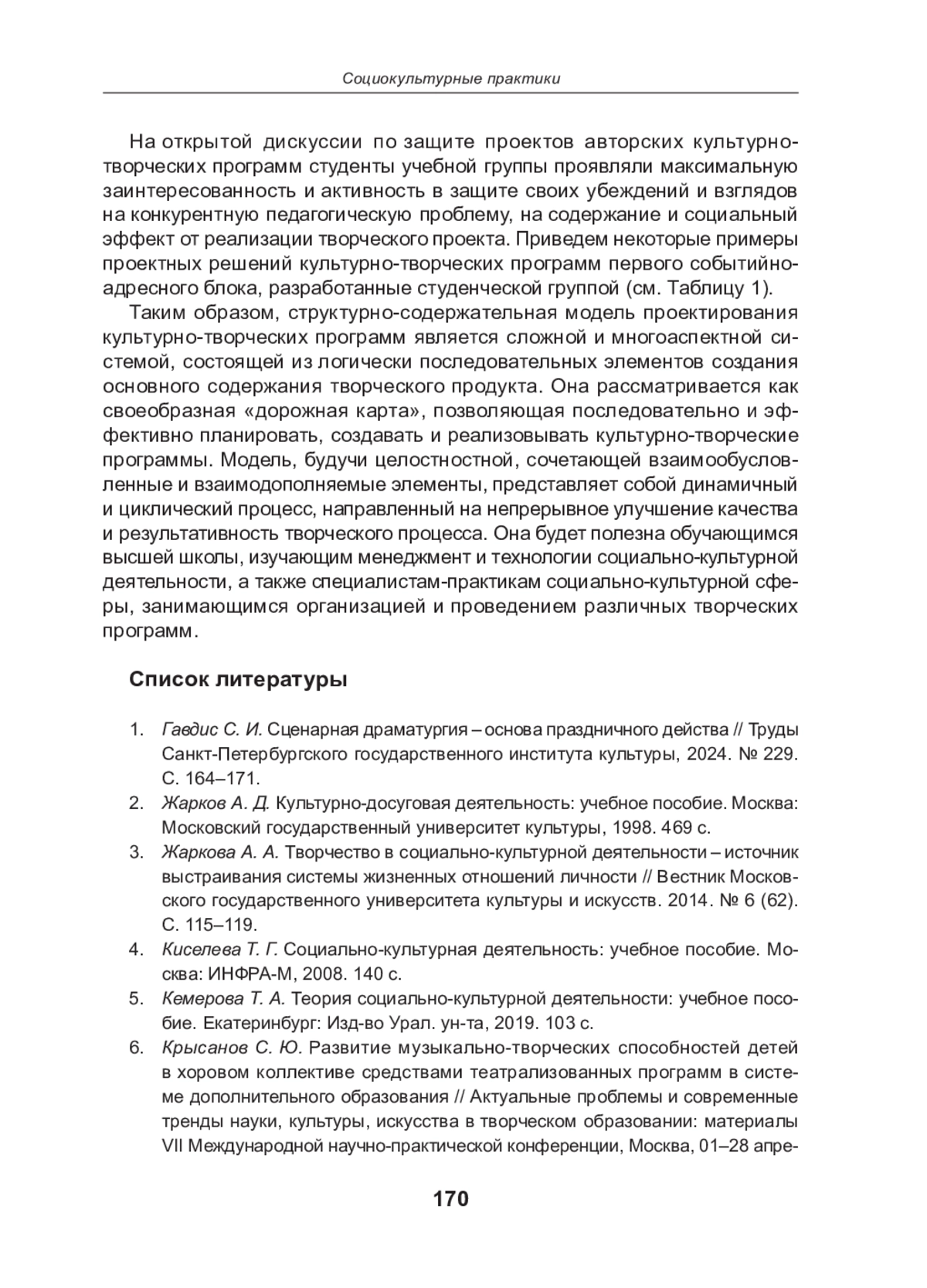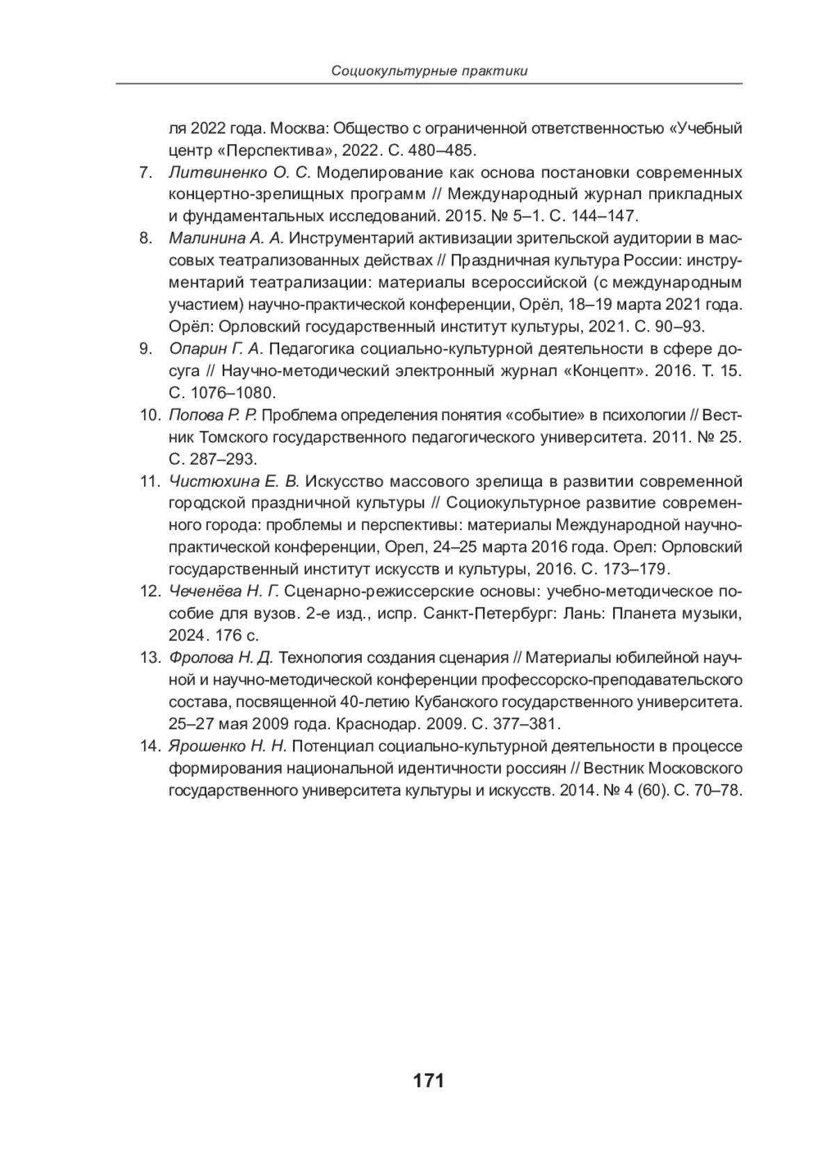 1. Гавдис С. И. Сценарная драматургия - основа праздничного действа // Труды Санкт-Петербургского государственного института культуры, 2024. № 229. С. 164-171. EDN: SAVNBS