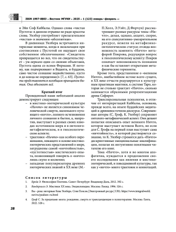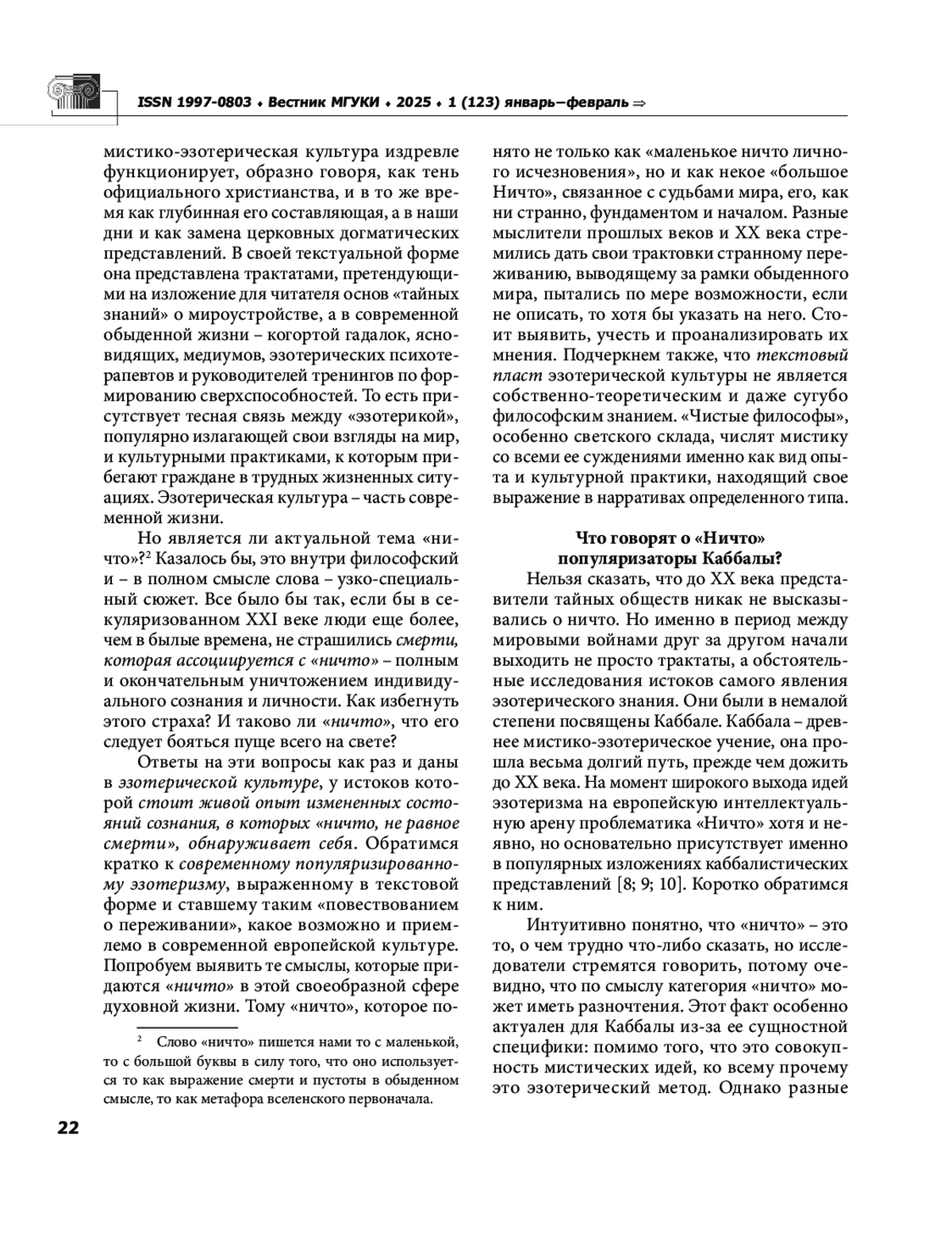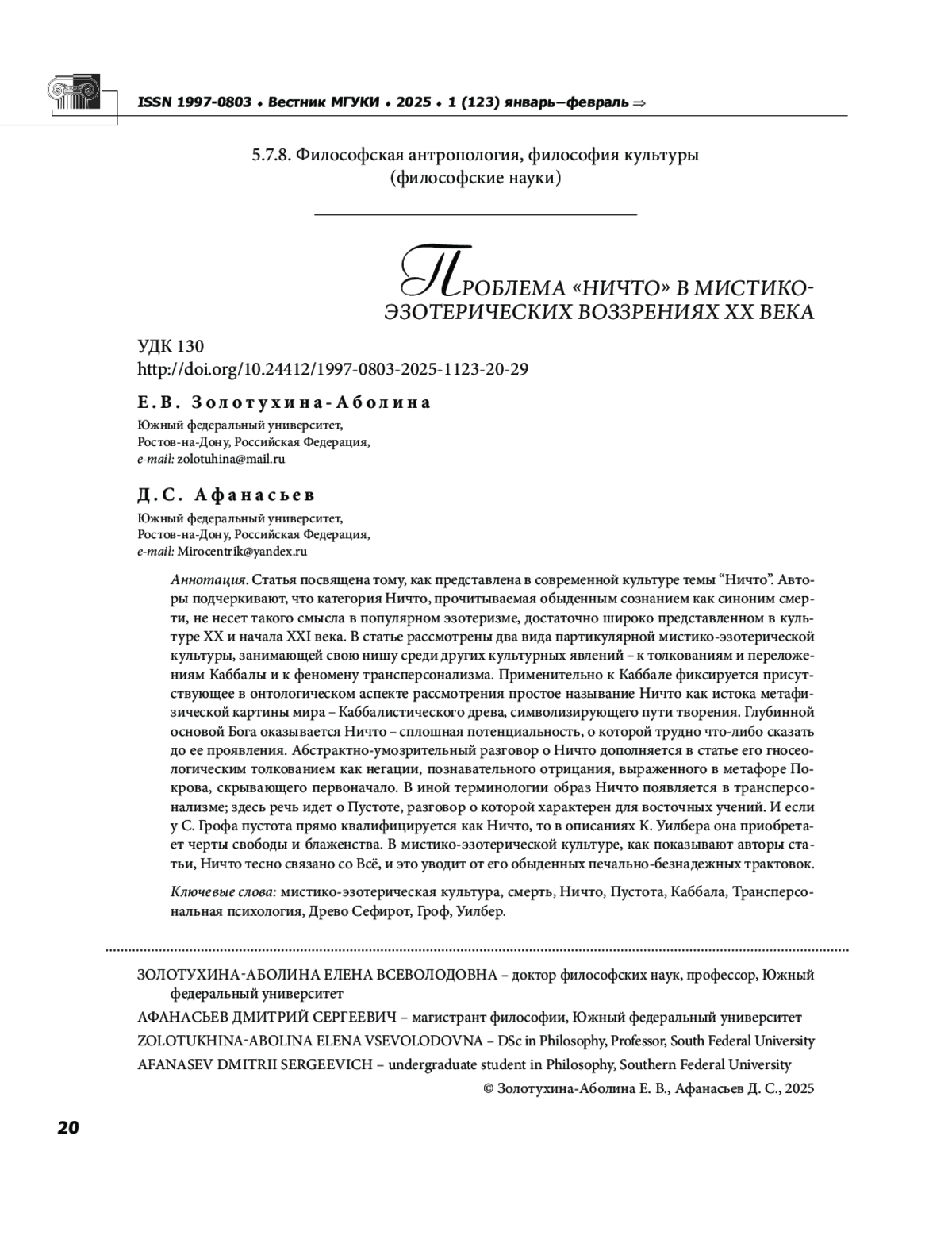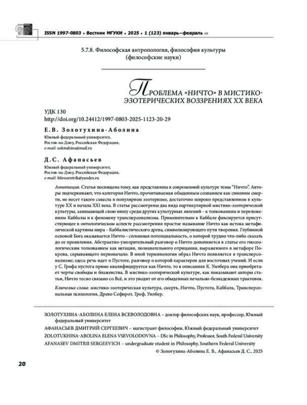 Статья посвящена тому, как представлена в современной культуре темы “Ничто”. Авторы подчеркивают, что категория Ничто, прочитываемая обыденным сознанием как синоним смерти, не несет такого смысла в популярном эзотеризме, достаточно широко представленном в культуре XX и начала ХХI века. В статье рассмотрены два вида партикулярной мистико-эзотерической культуры, занимающей свою нишу среди других культурных явлений к толкованиям и переложениям Каббалы и к феномену трансперсонализма. Применительно к Каббале фиксируется присутствующее в онтологическом аспекте рассмотрения простое называние Ничто как истока метафизической картины мира Каббалистического древа, символизирующего пути творения. Глубинной основой Бога оказывается Ничто сплошная потенциальность, о которой трудно что либо сказать до ее проявления. Абстрактно умозрительный разговор о Ничто дополняется в статье его гносеологическим толкованием как негации, познавательного отрицания, выраженного в метафоре Покрова, скрывающего первоначало. В иной терминологии образ Ничто появляется в трансперсонализме; здесь речь идет о Пустоте, разговор о которой характерен для восточных учений. И если у С. Грофа пустота прямо квалифицируется как Ничто, то в описаниях К. Уилбера она приобретает черты свободы и блаженства. В мистико-эзотерической культуре, как показывают авторы статьи, Ничто тесно связано со Всё, и это уводит от его обыденных печально безнадежных трактовок.