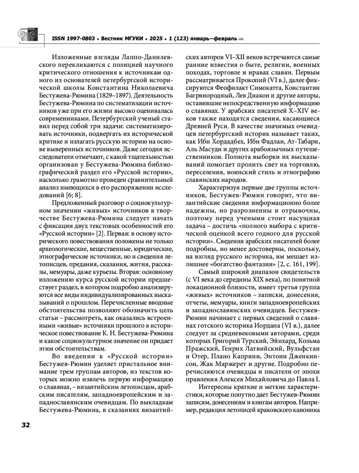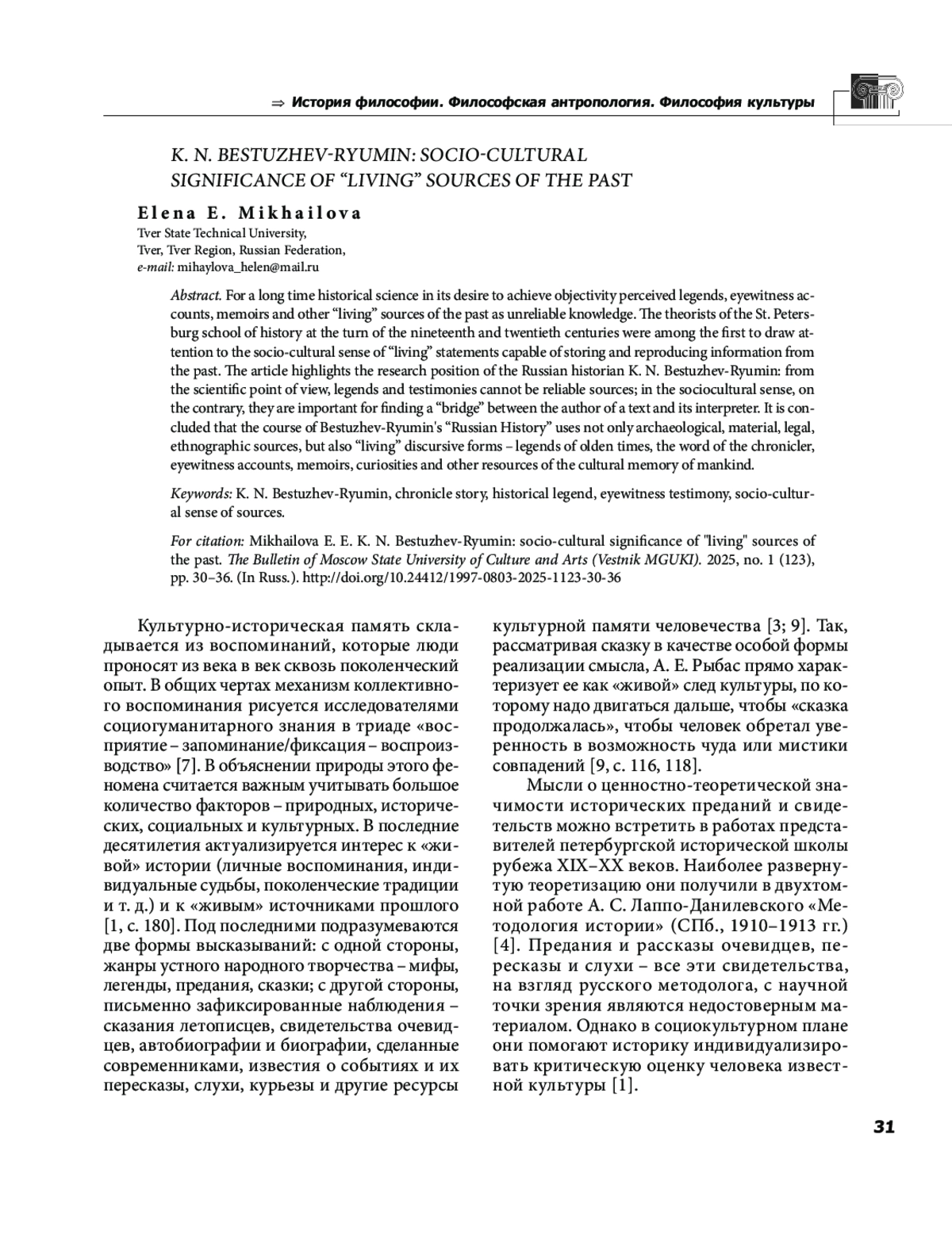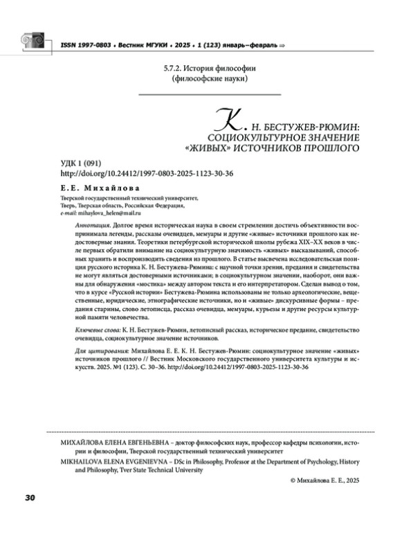 Долгое время историческая наука в своем стремлении достичь объективности воспринимала легенды, рассказы очевидцев, мемуары и другие «живые» источники прошлого как недостоверные знания. Теоретики петербургской исторической школы рубежа XIX XX веков в числе первых обратили внимание на социокультурную значимость «живых» высказываний, способных хранить и воспроизводить сведения из прошлого. В статье высвечена исследовательская позиция русского историка К. Н. Бестужева Рюмина: с научной точки зрения, предания и свидетельства не могут являться достоверными источниками; в социокультурном значении, наоборот, они важны для обнаружения «мостика» между автором текста и его интерпретатором. Сделан вывод о том, что в курсе «Русской истории» Бестужева Рюмина использованы не только археологические, вещественные, юридические, этнографические источники, но и «живые» дискурсивные формы предания старины, слово летописца, рассказ очевидца, мемуары, курьезы и другие ресурсы культурной памяти человечества.
