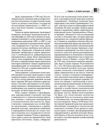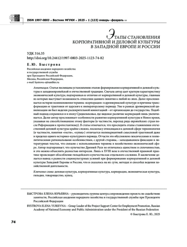 Статья посвящена установлению этапов формирования корпоративной и деловой культуры в западноевропейской и отечественной традиции. Сначала автор дает краткую характеристику экономической культуре, подчеркивая ее отличия от корпоративной и деловой культуры, главным из которых выступает возможность отнесения данного понятия к любой из эпох. Далее прослеживается история возникновения термина «корпорация» в древнеримской культуре и причины трансформации ее трактовки от царского к императорскому периоду. Уже в рамках древнеримской цивилизации он был наделен расширительной коннотацией от организации до государства. Подобный подход сохранился и в эпоху Средневековья, где видовое различие корпораций лишь увеличивается. Далее автор прослеживает особенности развития корпоративной культуры в Новое время, указывая на способствовавшие этому факторы (в частности, переход ряда европейских стран после Реформации к протестантизму). В статье отмечается, что проследить этапы становления отечественной деловой культуры крайне сложно, поскольку относящаяся к деловой сфере терминология (в частности, понятия «гости», «купец») отличается поливариантной смысловой трактовкой даже в пределах одного историко-культурного периода. Отчасти это обусловлено лексическими и геополитическими региональными особенностями, с другой стороны, запаздыванием фиксации в литературных текстах, что связано с использованием термина в хозяйственно-экономической сфере. Автор подчеркивает, что купечество Древней Руси не отличалось единством и сплоченностью, и это можно объяснить разностью интересов. Лишь в ХVIII веке в отечественной правовой практике происходит обособление гильдейского купечества как отдельного сословия. В заключение делается вывод о разности социокультурных условий при формировании корпоративной и деловой культуры Западной Европы и России, что и сказалось на их сути, методах и способах ведения хозяйственной деятельности.