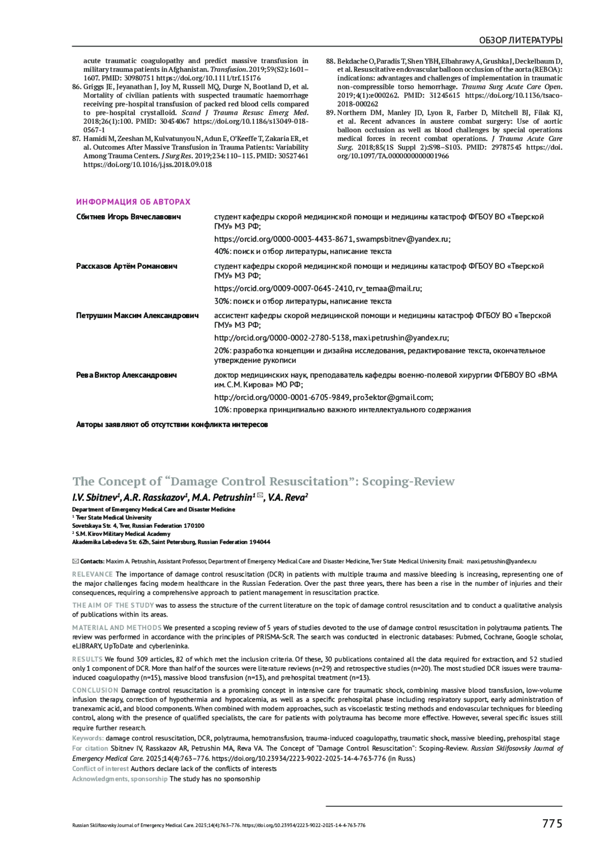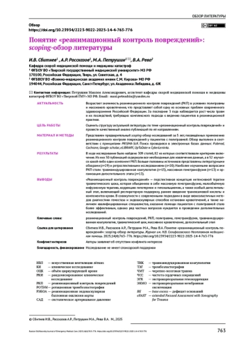 Представлен предварительный scoping-обзор исследований за 5 лет, посвящённых применению реанимационного контроля повреждений у пациентов с политравмой. Обзор выполнен в соответствии с принципами PRISMA-ScR. Поиск проводился в электронных базах данных: Pubmed, Cochrane, Google scholar, eLIBRARY, UpToDate и CyberLeninka. Результаты В ходе исследования было найдено 309 статей, 82 из которых соответствовали критериям включения. Из них 30 публикаций содержали все необходимые для извлечения данные, а в 52 изучался какой-либо один компонент РКП. Больше половины источников представлены литературными обзорами (n=29) и ретроспективными исследованиями (n=20). Наиболее изучаемыми вопросами РКП стали: травмаиндуцированная коагулопатия (n=15), массивная гемотрансфузия (n=13) и организация догоспитального этапа (n=13).