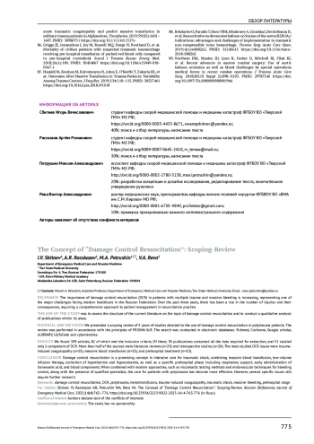 «Реанимационный контроль повреждений» - перспективная концепция интенсивной терапии травматического шока, которая объединила в себе массивную гемотрансфузию, малообъёмную инфузионную терапию, коррекцию гипотермии и гипокальциемии, а также особый догоспитальный этап, включающий респираторную поддержку, раннее введение транексамовой кислоты и компонентов крови. В совокупности с современными подходами в виде вязкоэластичных методов диагностики гемостаза и эндоваскулярных способов остановки кровотечений, а также наличием квалифицированных специалистов, оказание помощи пациентам с политравмой стало более эффективным, однако ряд частных вопросов нуждается в проведении дополнительных исследований.