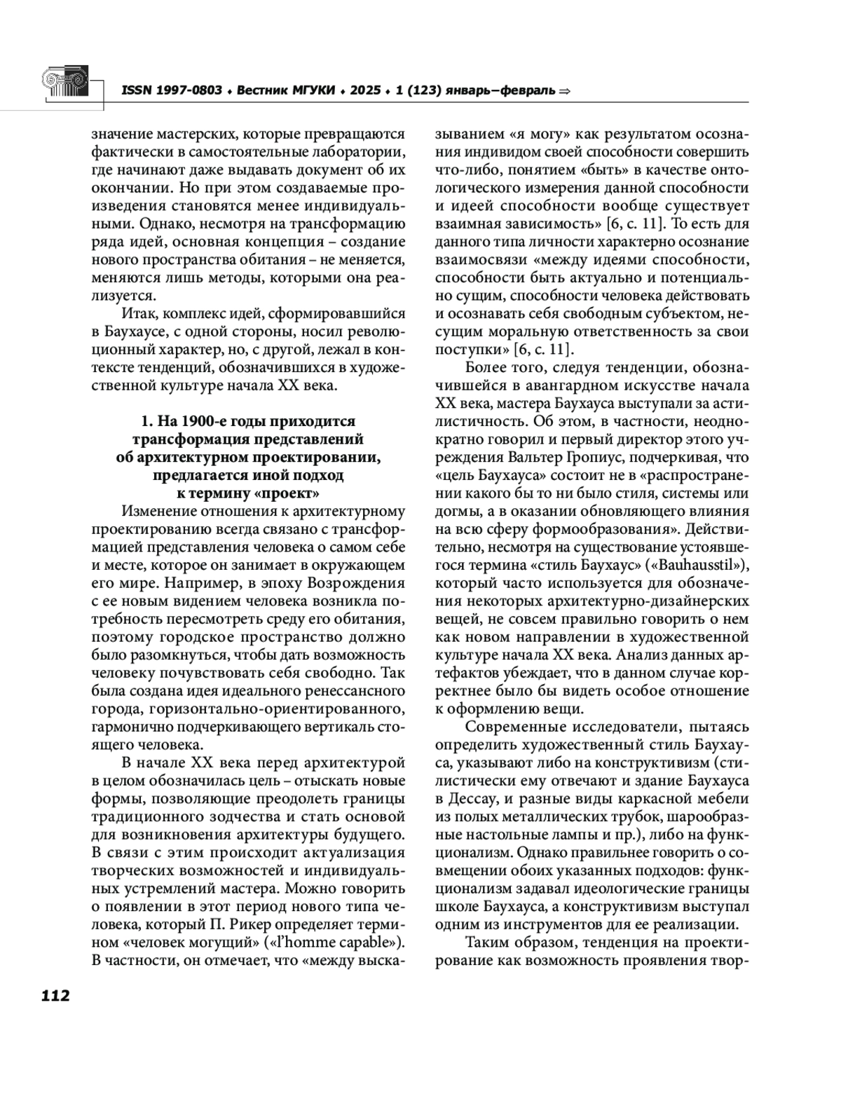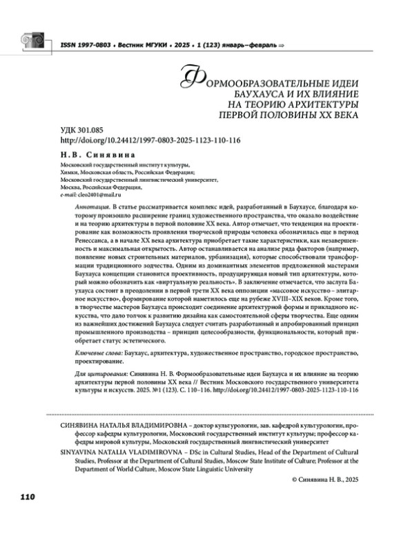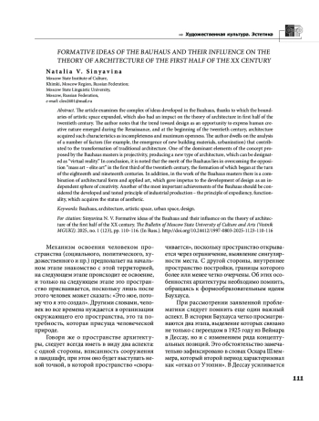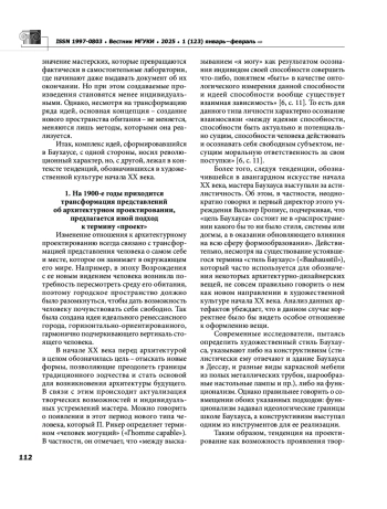 В статье рассматривается комплекс идей, разработанный в Баухаусе, благодаря которому произошло расширение границ художественного пространства, что оказало воздействие и на теорию архитектуры в первой половине ХХ века. Автор отмечает, что тенденция на проектирование как возможность проявления творческой природы человека обозначилась еще в период Ренессанса, а в начале ХХ века архитектура приобретает такие характеристики, как незавершенность и максимальная открытость. Автор останавливается на анализе ряда факторов (например, появление новых строительных материалов, урбанизация), которые способствовали трансформации традиционного зодчества. Одним из доминантных элементов предложенной мастерами Баухауса концепции становится проективность, продуцирующая новый тип архитектуры, который можно обозначить как «виртуальную реальность». В заключение отмечается, что заслуга Баухауса состоит в преодолении в первой трети ХХ века оппозиции «массовое искусство элитарное искусство», формирование которой наметилось еще на рубеже ХVIII ХIХ веков. Кроме того, в творчестве мастеров Баухауса происходит соединение архитектурной формы и прикладного искусства, что дало толчок к развитию дизайна как самостоятельной сферы творчества. Еще одним из важнейших достижений Баухауса следует считать разработанный и апробированный принцип промышленного производства принцип целесообразности, функциональности, который приобретает статус эстетического.