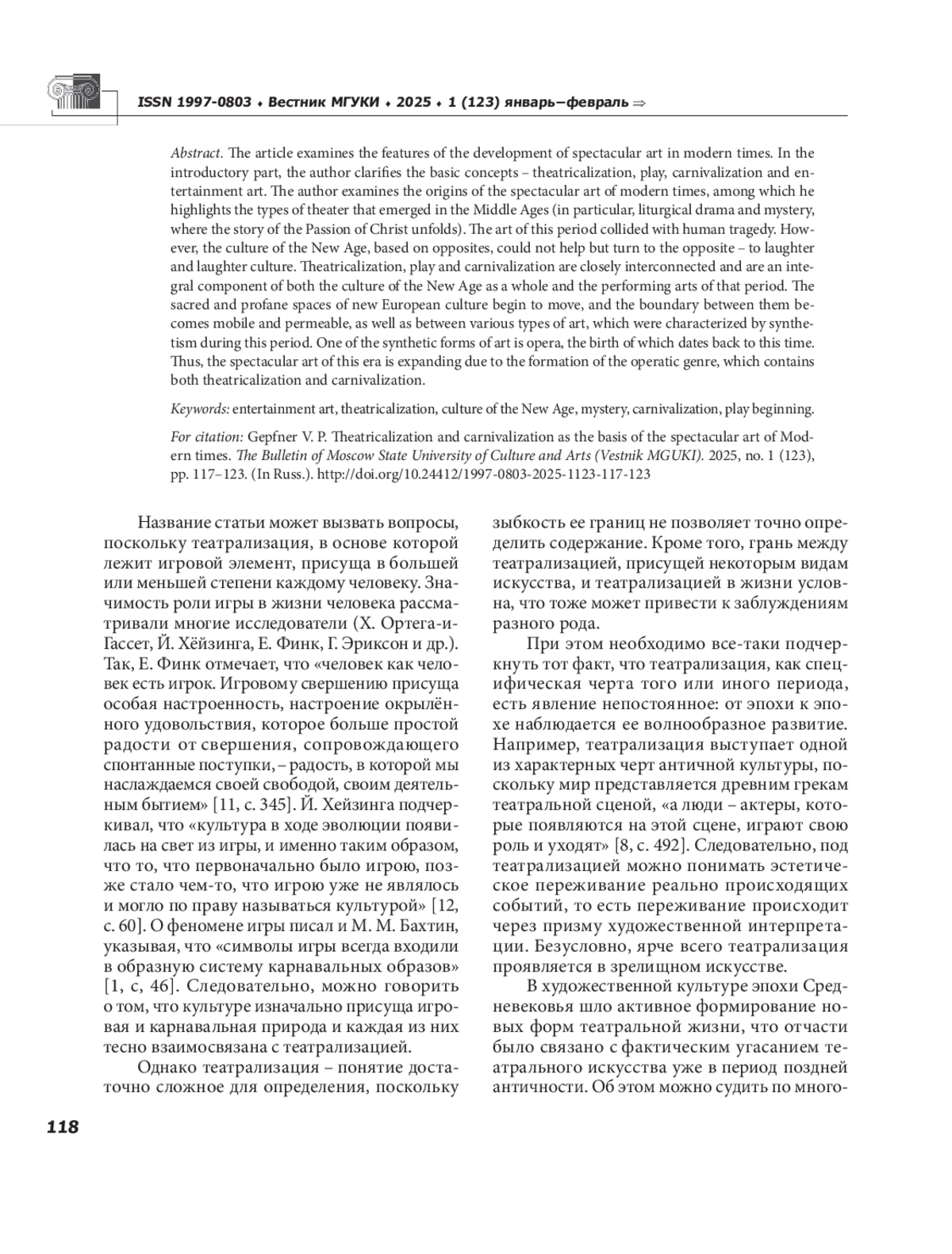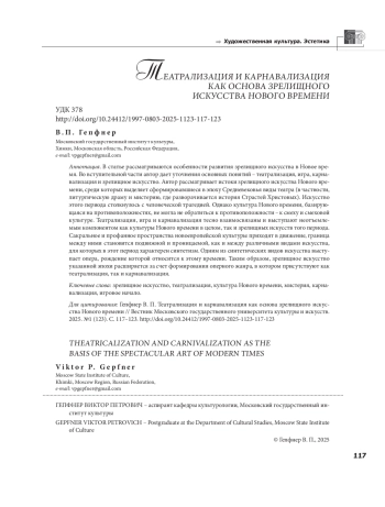 В статье рассматриваются особенности развития зрелищного искусства в Новое время. Во вступительной части автор дает уточнения основных понятий – театрализация, игра, карнавализация и зрелищное искусство. Автор рассматривает истоки зрелищного искусства Нового времени, среди которых выделяет сформировавшиеся в эпоху Средневековья виды театра (в частности, литургическую драму и мистерию, где разворачивается история Страстей Христовых). Искусство этого периода столкнулось с человеческой трагедией. Однако культура Нового времени, базирующаяся на противоположностях, не могла не обратиться к противоположности – к смеху и смеховой культуре. Театрализация, игра и карнавализация тесно взаимосвязаны и выступают неотъемлемым компонентом как культуры Нового времени в целом, так и зрелищных искусств того периода. Сакральное и профанное пространства новоевропейской культуры приходят в движение, граница между ними становится подвижной и проницаемой, как и между различными видами искусства, для которых в этот период характерен синтетизм. Одним из синтетических видов искусства выступает опера, рождение которой относится к этому времени. Таким образом, зрелищное искусство указанной эпохи расширяется за счет формирования оперного жанра, в котором присутствуют как театрализация, так и карнавализация.